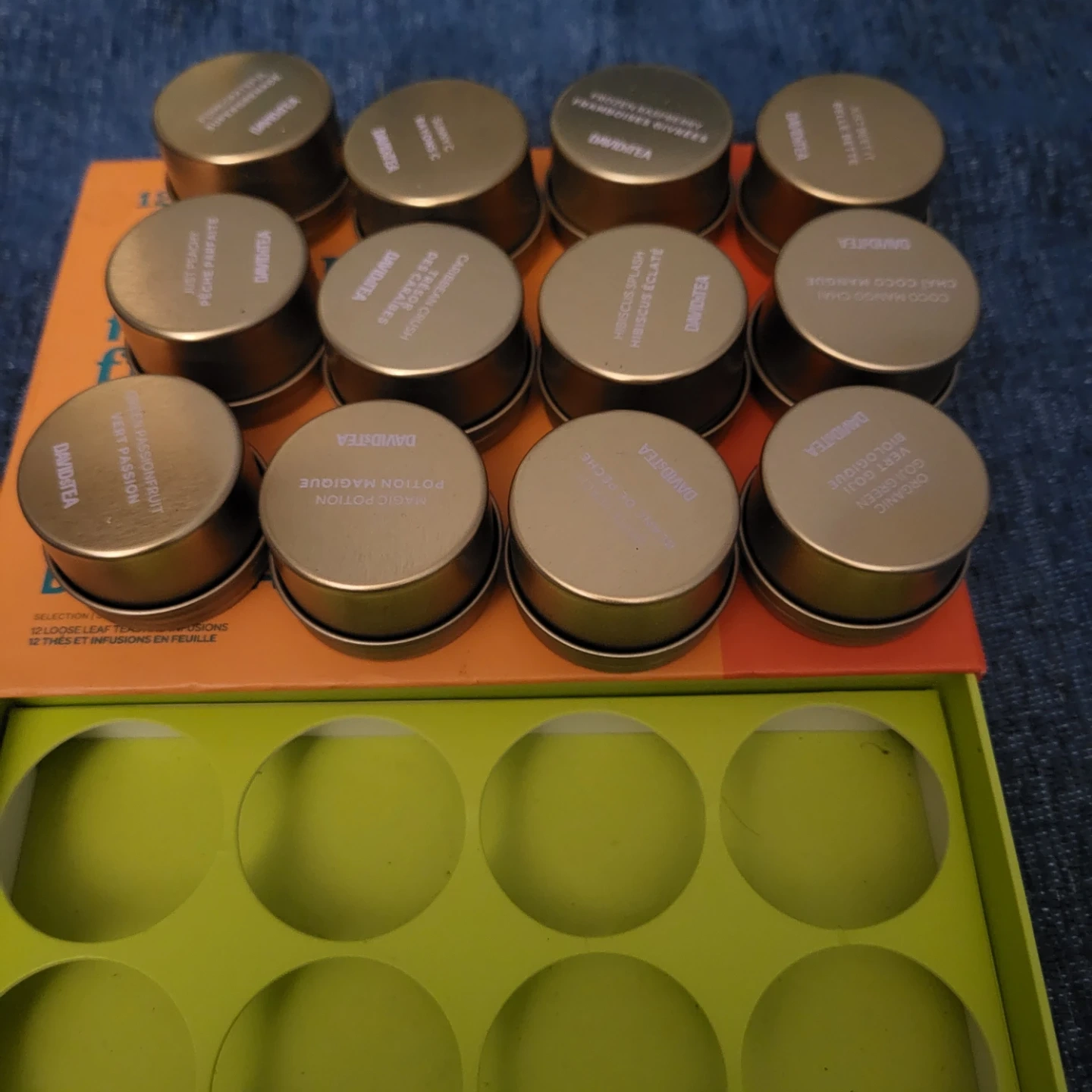 Selling a set of 12 empty DAVIDsTEA tea tins! These are perfect for storing small items, organizing your spices, or for crafting projects. The tins come in their original box, ready for a new purpose!