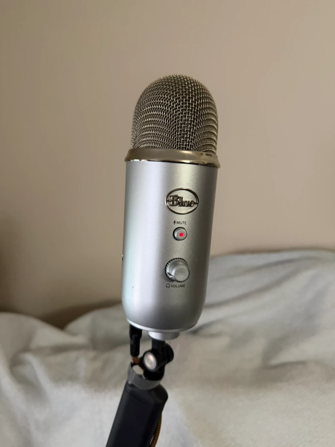Selling a Blue Yeti USB microphone in silver (approx $160 new) and a compatible desk mount (approx $120). Barely used; was no longer compatible with my dictation program.