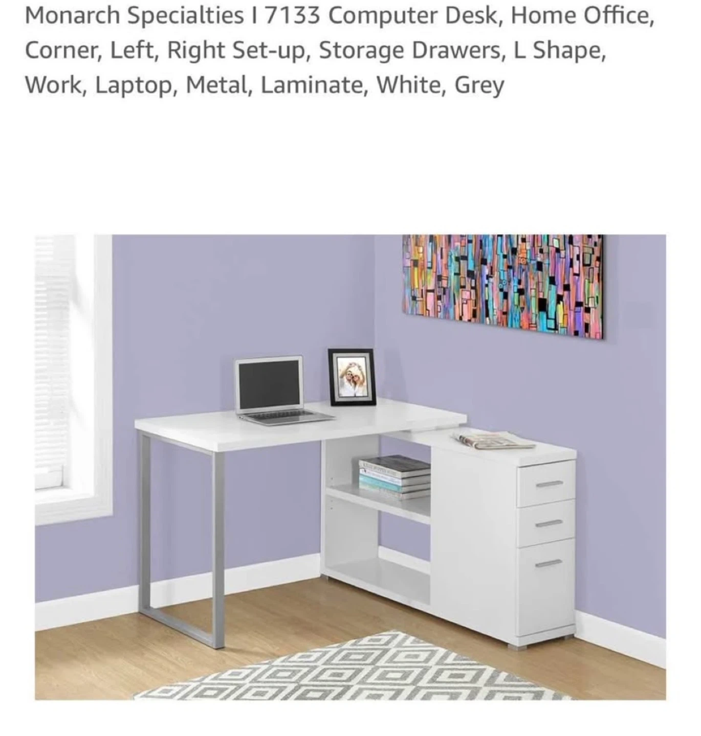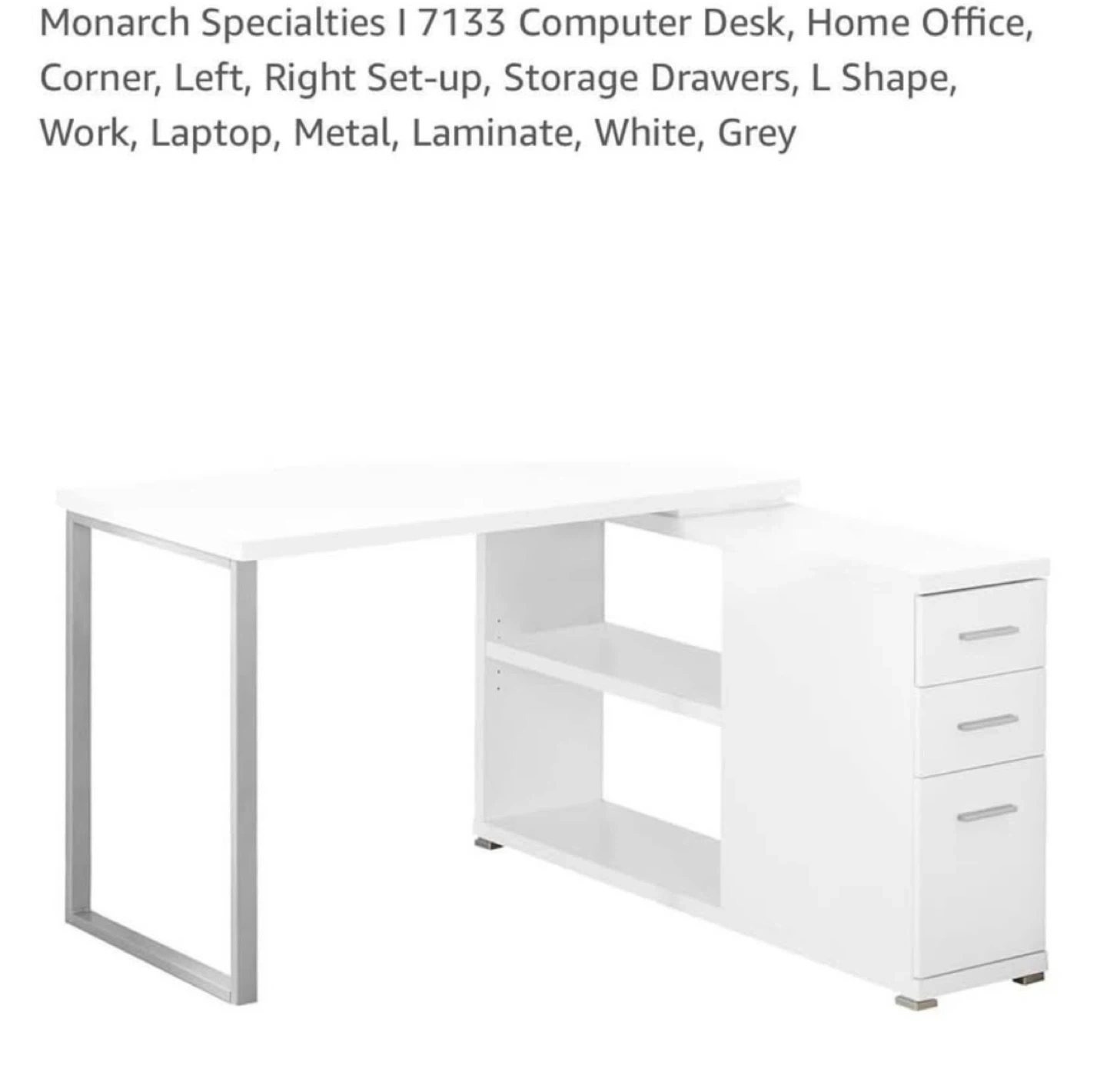 Selling a Monarch Specialties I 7133 computer desk, perfect for a home office setup! It's an L-shape design that can be set up for a corner, left, or right configuration. The desk includes storage drawers and is made of metal and laminate with a white and grey finish. Dimensions are 47.25" x 47.25" x 29.5"