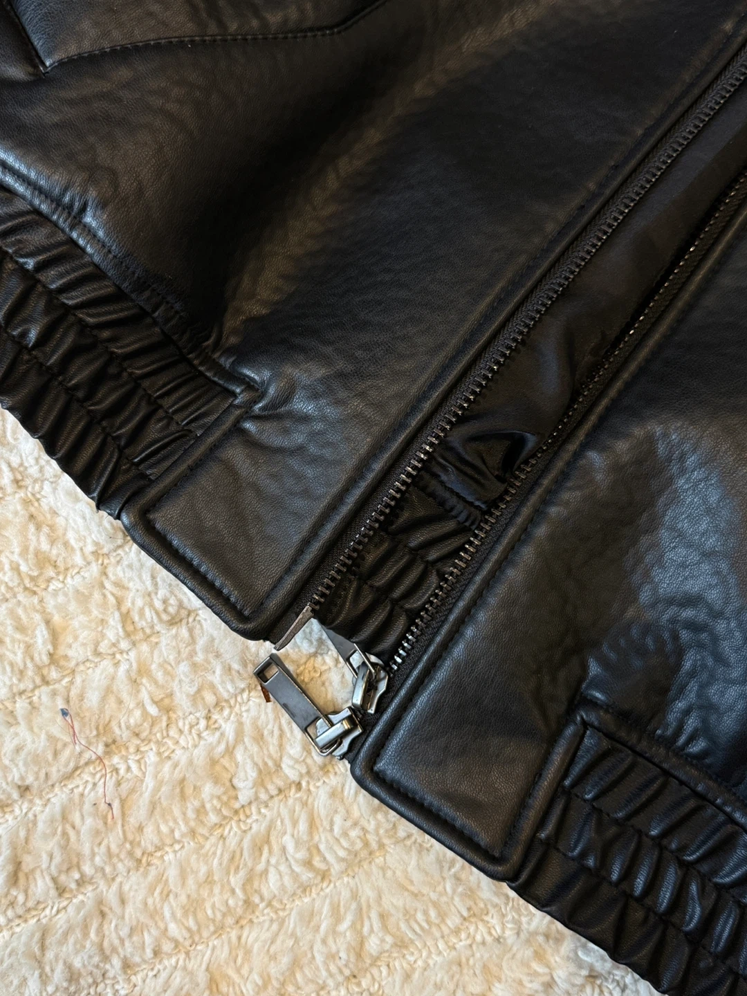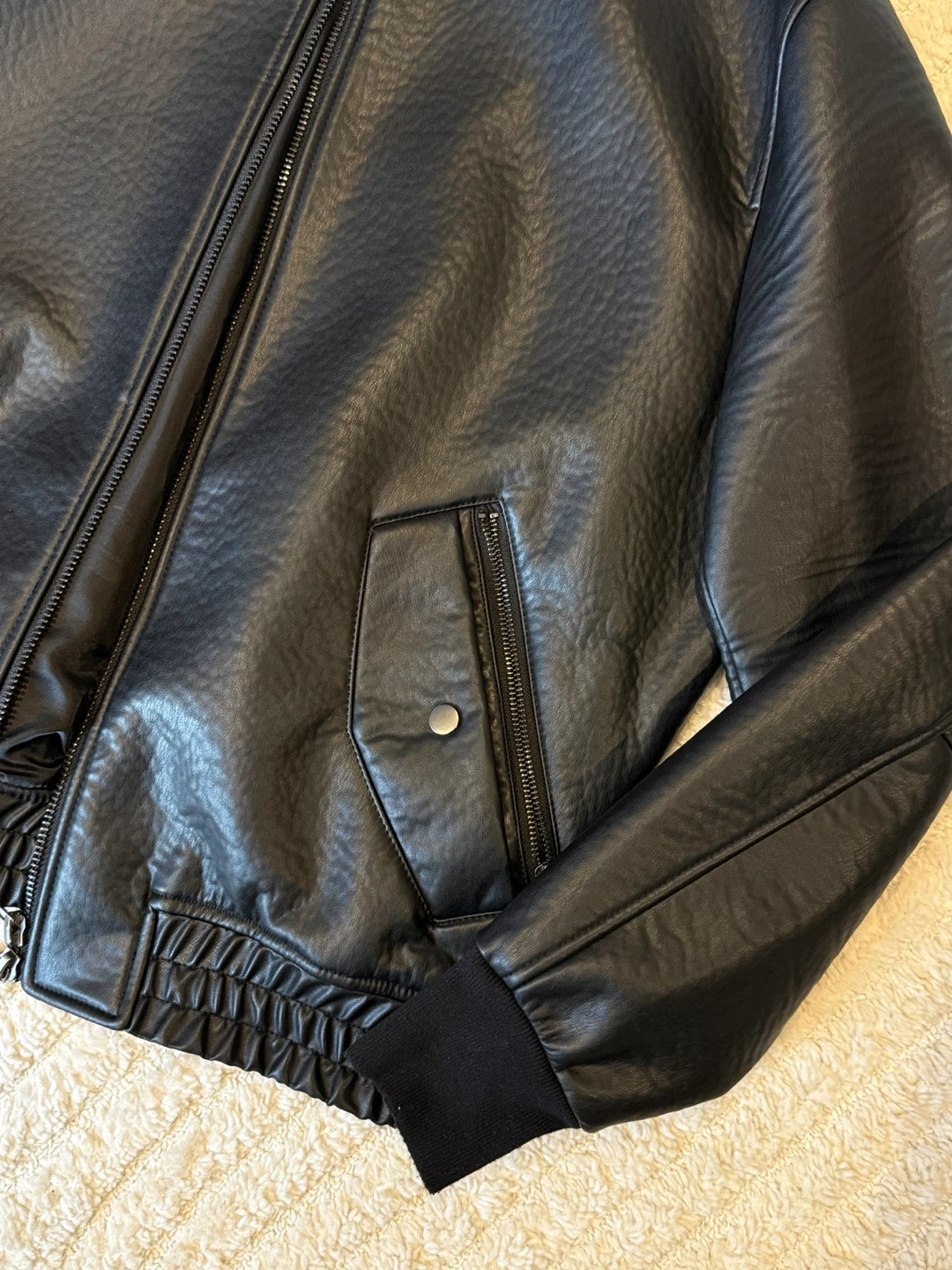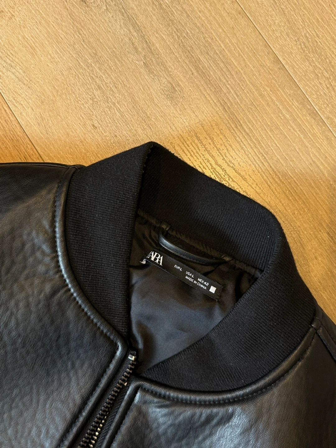 Selling a ZARA black faux leather bomber jacket in size L. This stylish jacket is in great condition and perfect for adding a touch of edge to any outfit. It features a classic bomber silhouette with ribbed cuffs and hem, a front zip closure, and functional pockets. A versatile piece for your wardrobe!