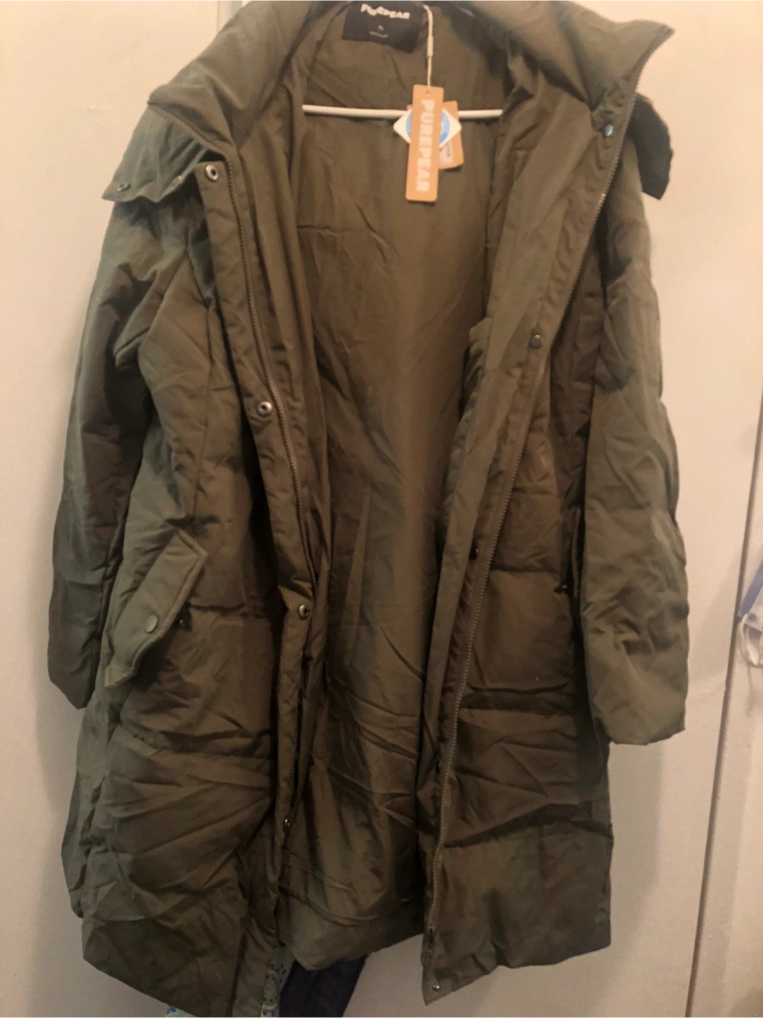 Selling a Purepear puffer jacket in olive green! It's a size XL. Great for staying warm and stylish during the colder months!