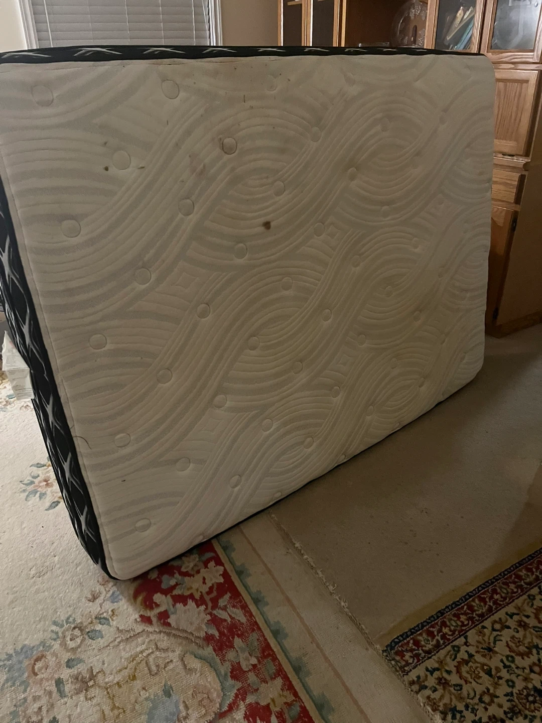 It’s a used mattress as seen in the photo. It has some visible stains and could use a cleaning but apart from that it’s very comfortable. You can have the box spring and frame as well. The frame is one of those metal frames under the box spring.