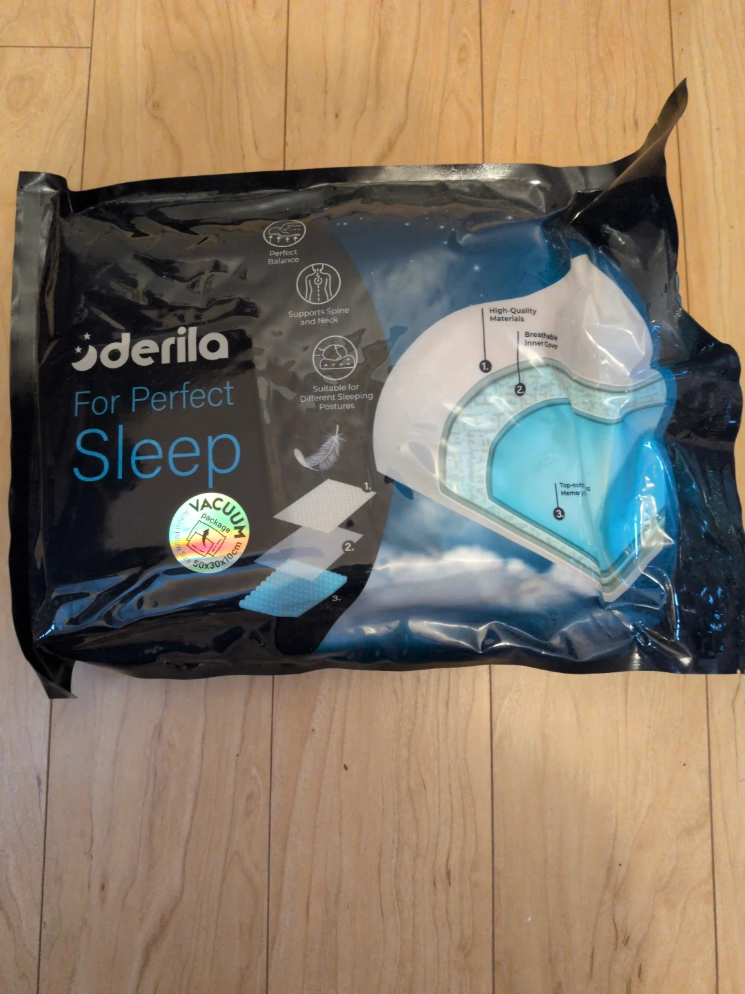 This is a Derila pillow designed for perfect sleep! It supports your spine and neck, making it suitable for different sleeping postures. It also has high-quality materials and a breathable inner cover