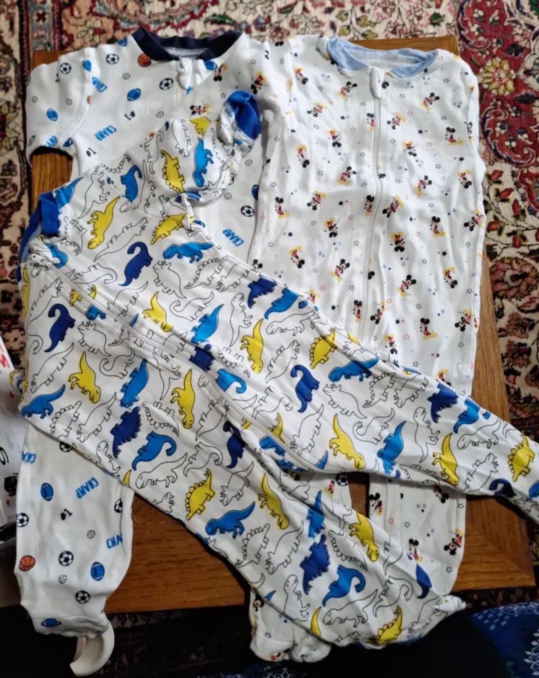 Selling a set of three onesies. There's one with dinosaurs, one with Mickey Mouse, and one with a sports theme. They're all in good condition and ready for a new little one!