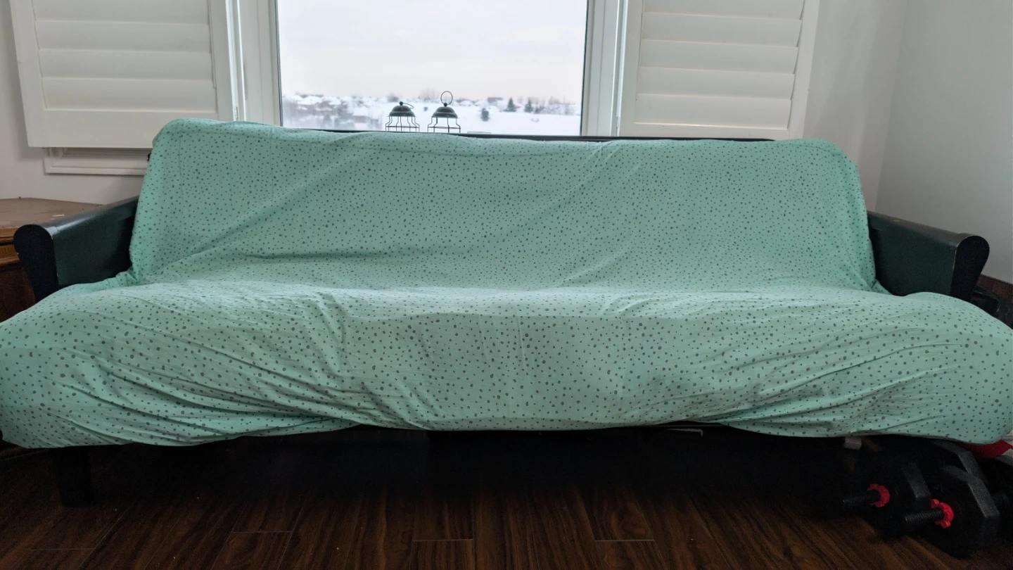 Selling a futon that's in great shape! It comes with a stylish mint green cover that adds a pop of colour to any room. Perfect for extra seating or a comfy guest bed.