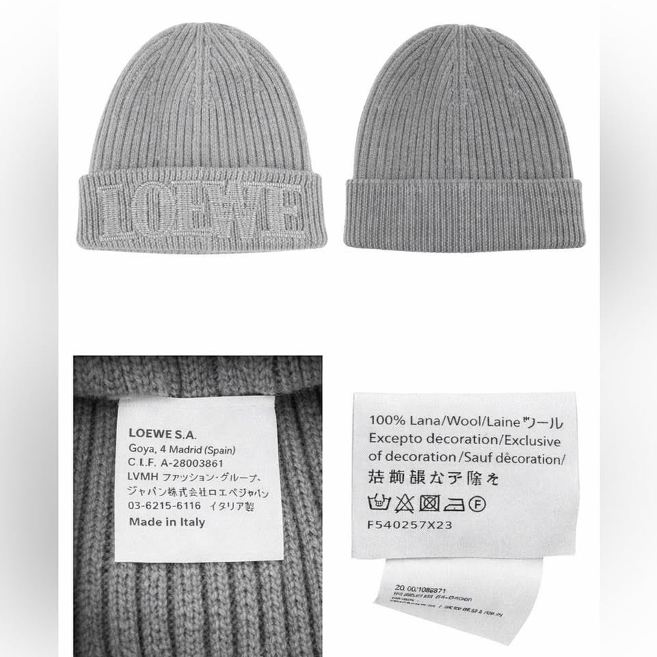 Authentic Loewe ribbed knit beanie crafted in Italy from 100% lana wool. Features a medium-weight ribbed knit, turn-up cuff, and signature blurred LOEWE embroidery at the front. Soft, warm, and timeless in a versatile grey shade.