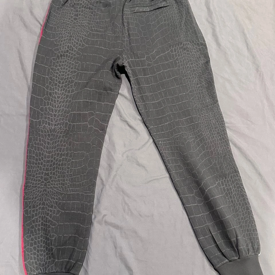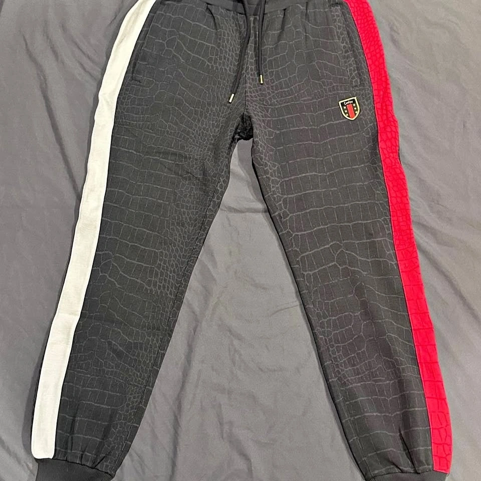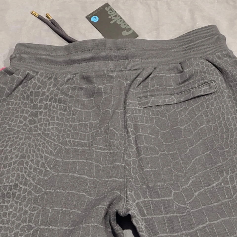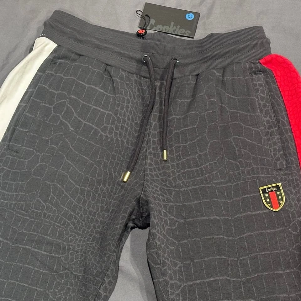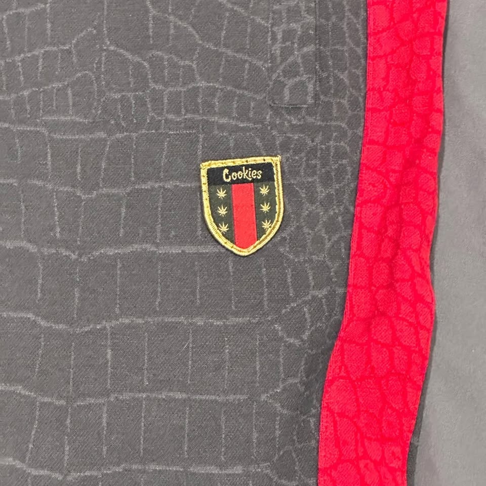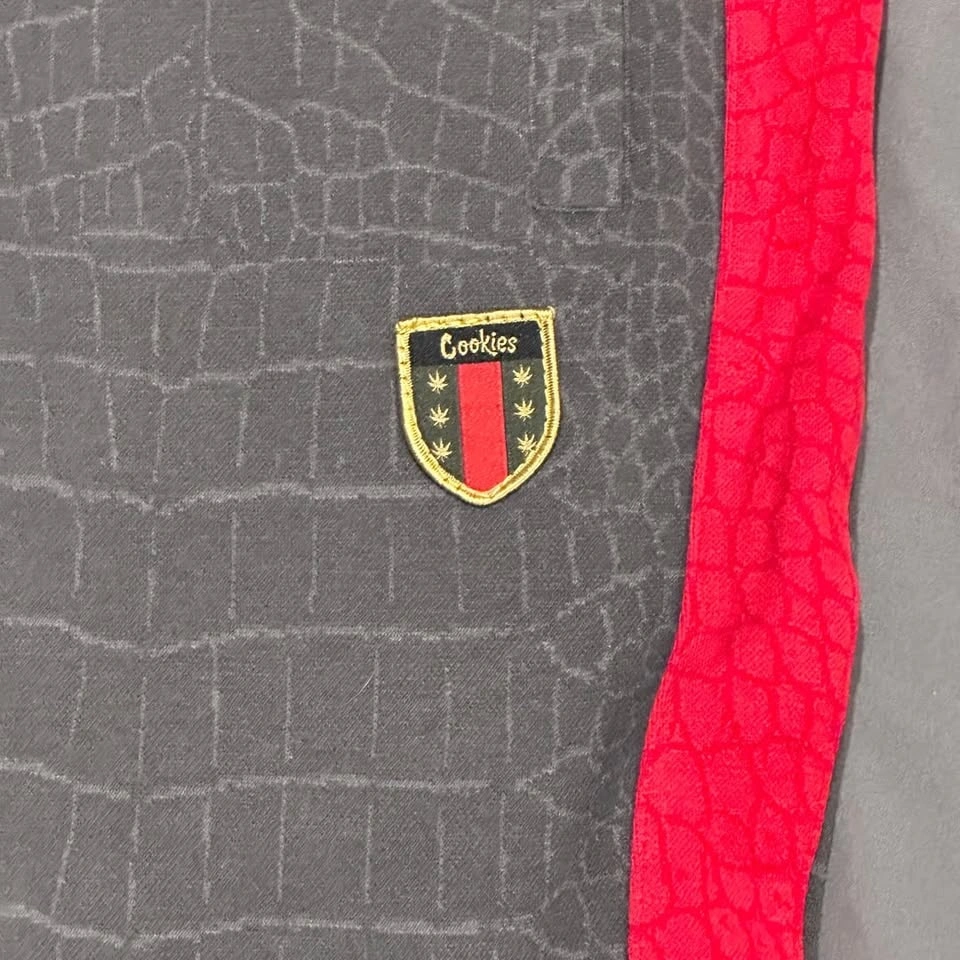 Cookies SF Black Tahoe Poly Knit Track Sweatpants, Crocodile Pattern, Men's Size M. These premium track pants feature a unique all-over croc-skin texture and contrasting side stripes in red and white.