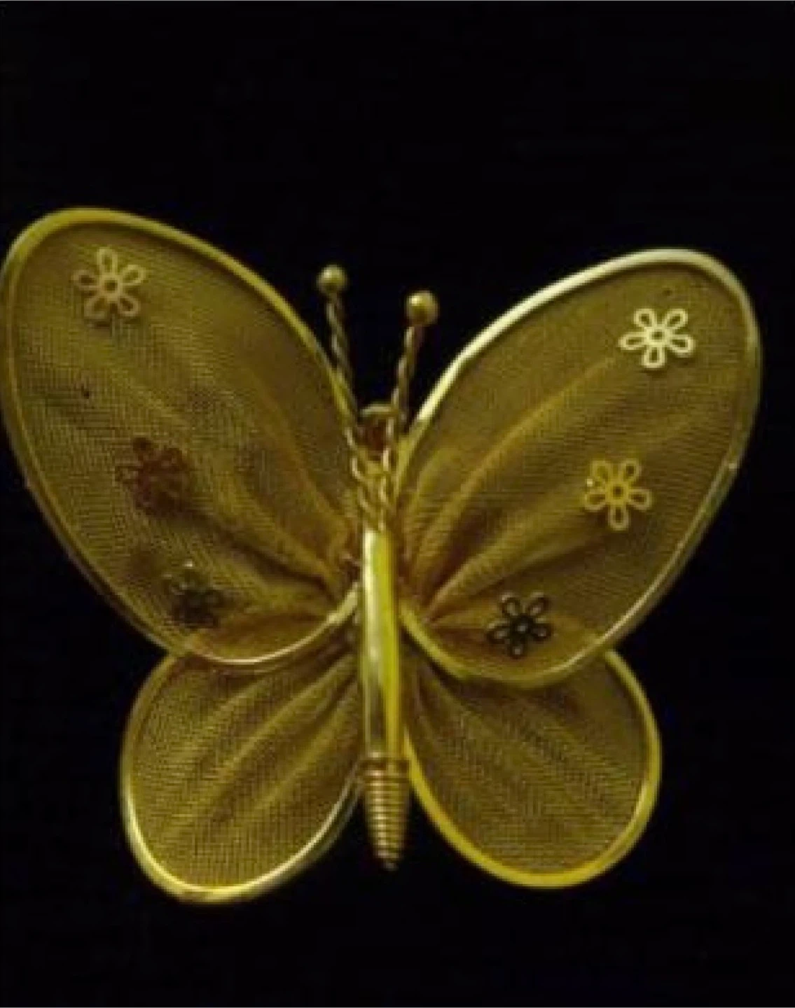 Great Vintage gold tone butterlfy mesh winged, butterfly pin, brooch. With tiny gold flower detailing on the mesh wings. Very unique piece, the mesh is firm, like a fine screen. There are fine details on the body and anntenae.