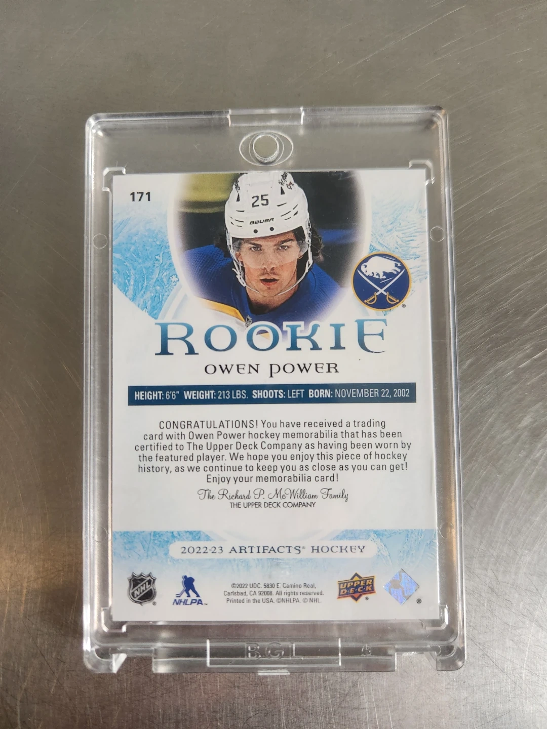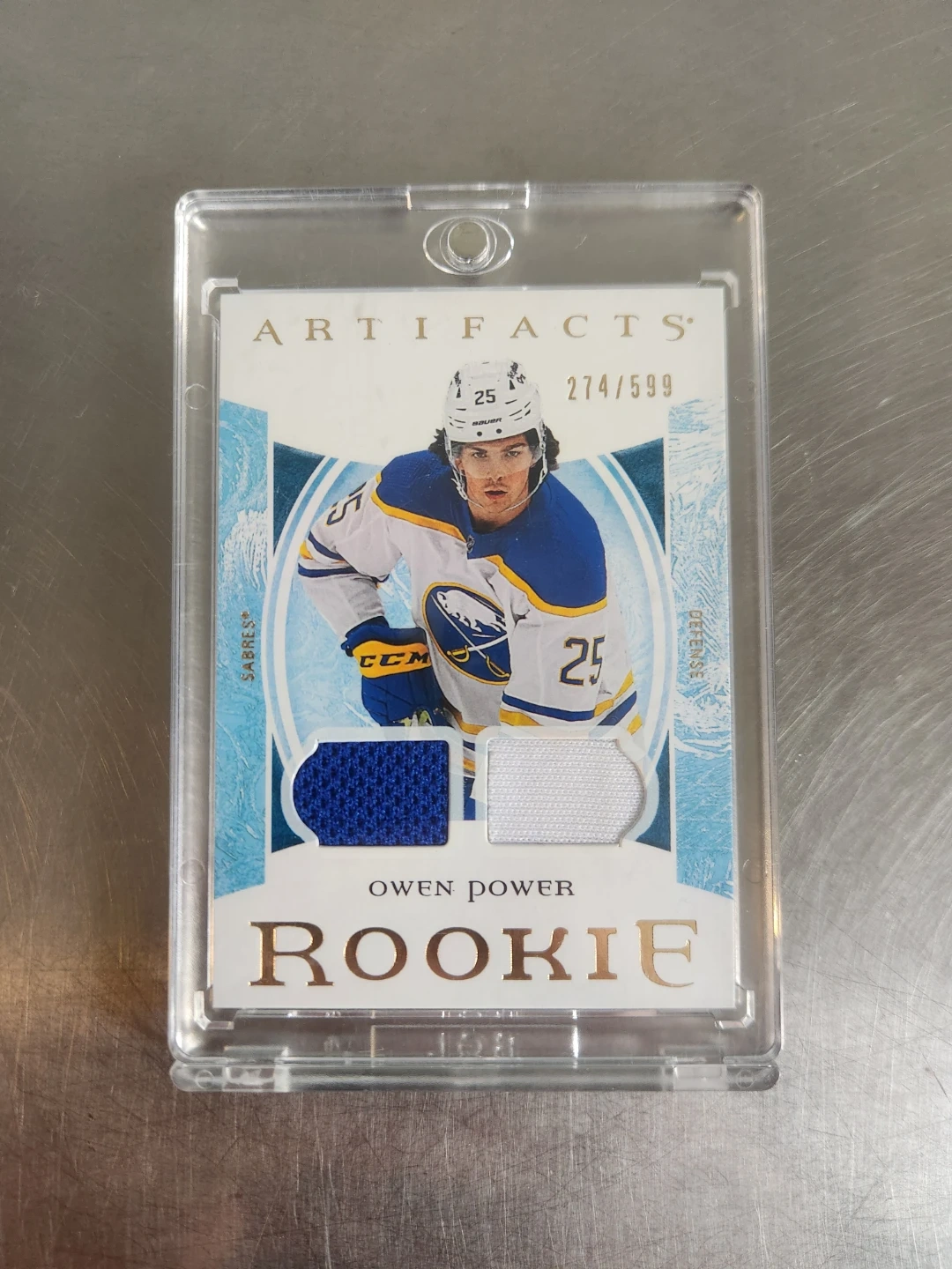 Selling an Owen Power rookie card from the 2022-23 Upper Deck Artifacts Hockey series. This card is numbered 274/599 and features a piece of memorabilia worn by Owen Power. A great addition for any hockey card collector!
