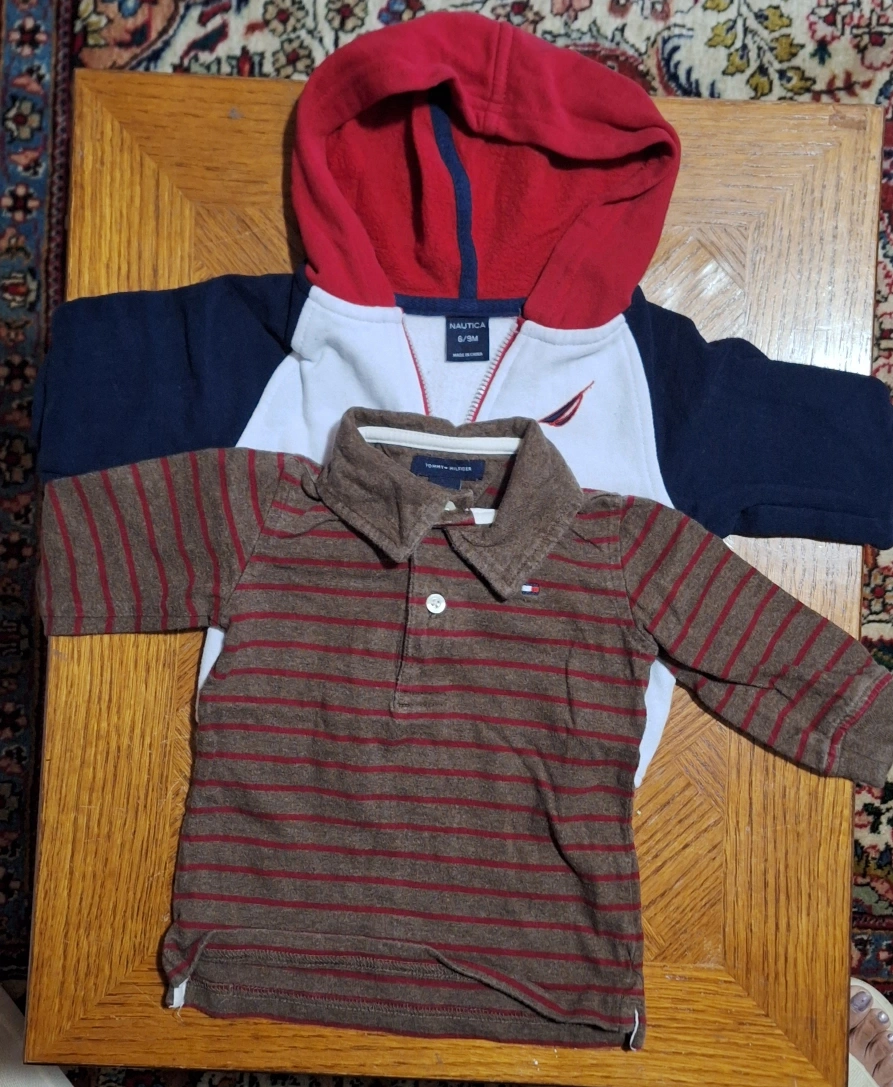 There's a Nautica hoodie in size 6-9M and a Tommy Hilfiger long-sleeve polo shirt. Both are in great condition and ready for a new little one