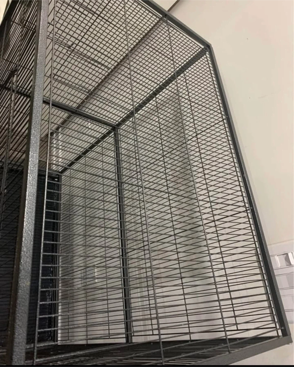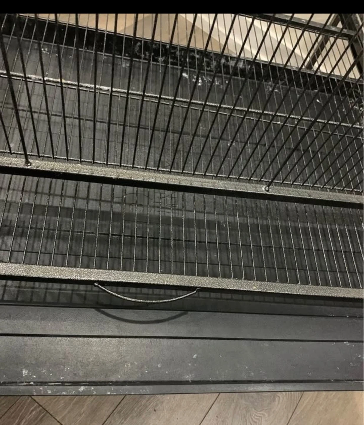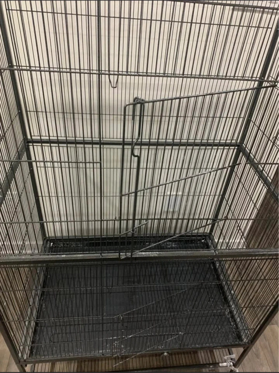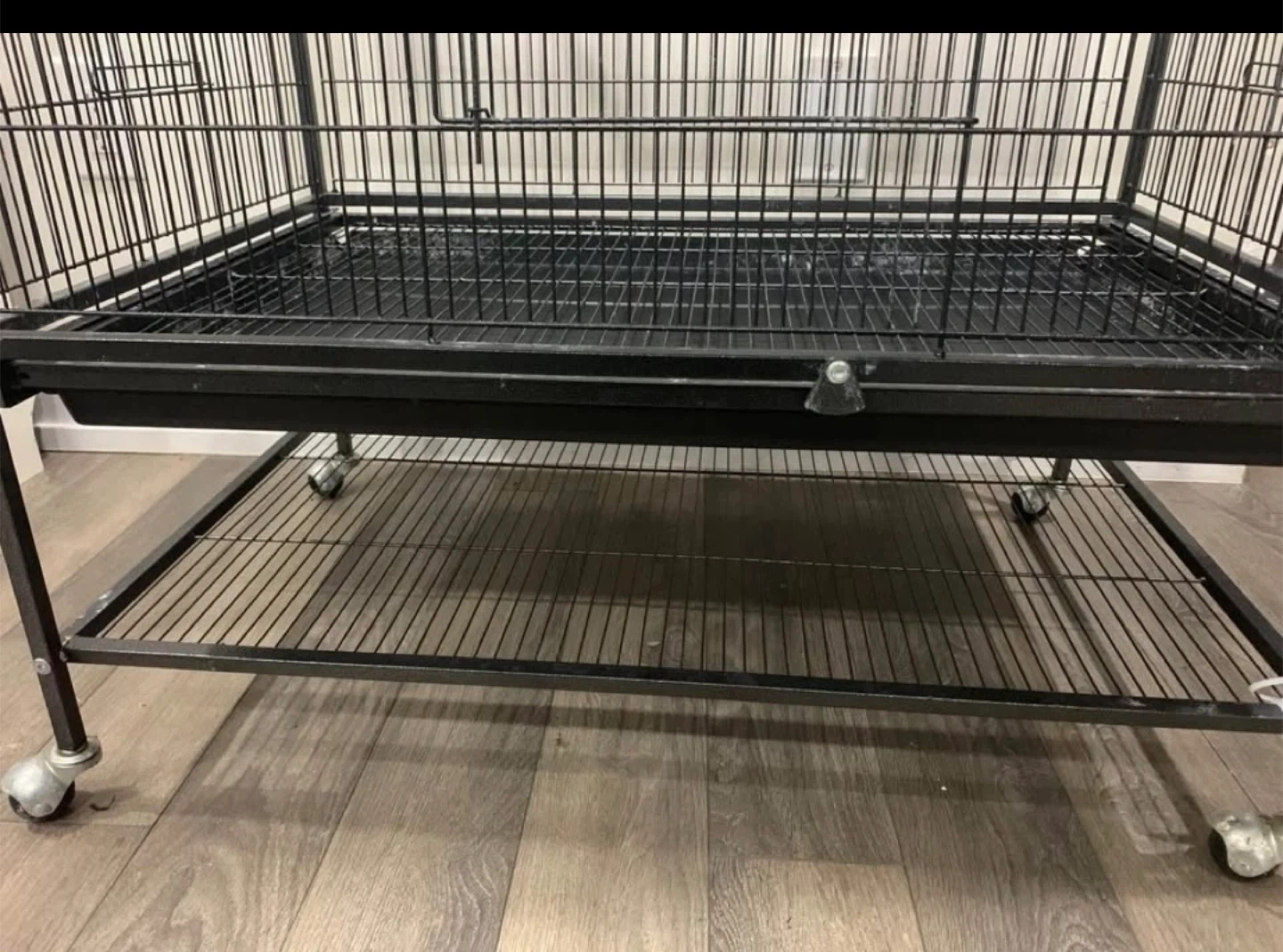 Selling a black metal bird cage. It's in good condition and ready for a new feathered friend! It has a bottom tray for easy cleaning and is on wheels for easy moving