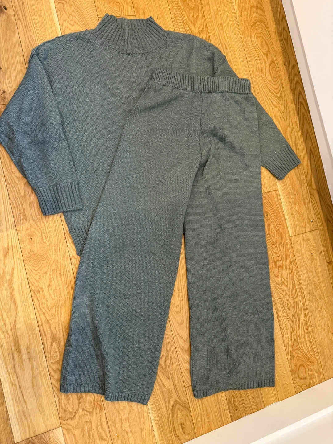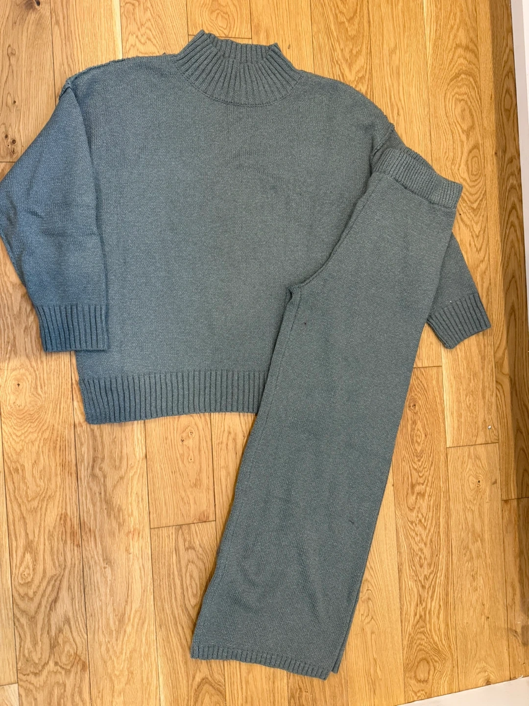 Cozy up with this comfy sweater and pants knit set! The set features a stylish sweater and matching pants, perfect for lounging at home or a casual day out. The soft knit material will keep you warm and comfortable all day long. The set is in great condition and ready for a new owner!