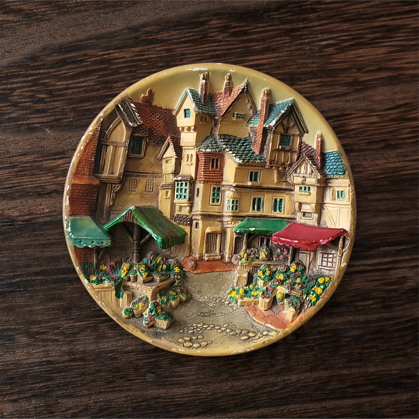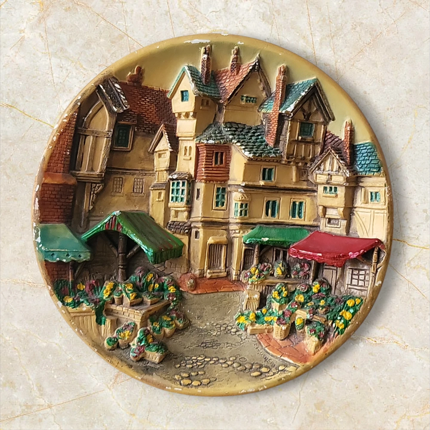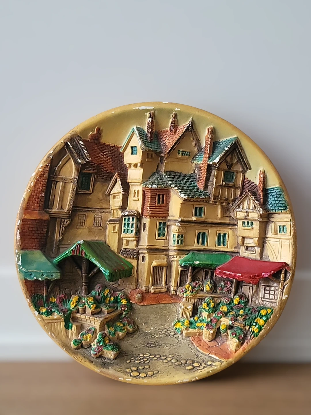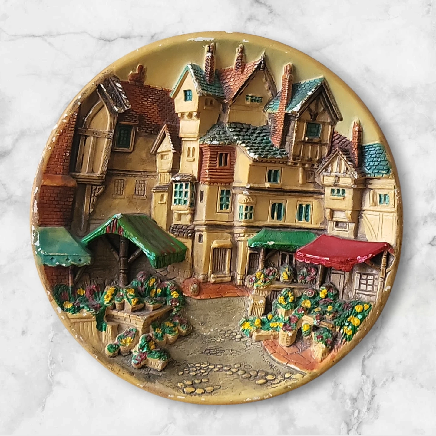 This is a charming vintage decorative wall plate featuring a detailed European town scene. It's perfect for adding a touch of old-world charm to any room. The plate is in good condition and ready to be displayed!