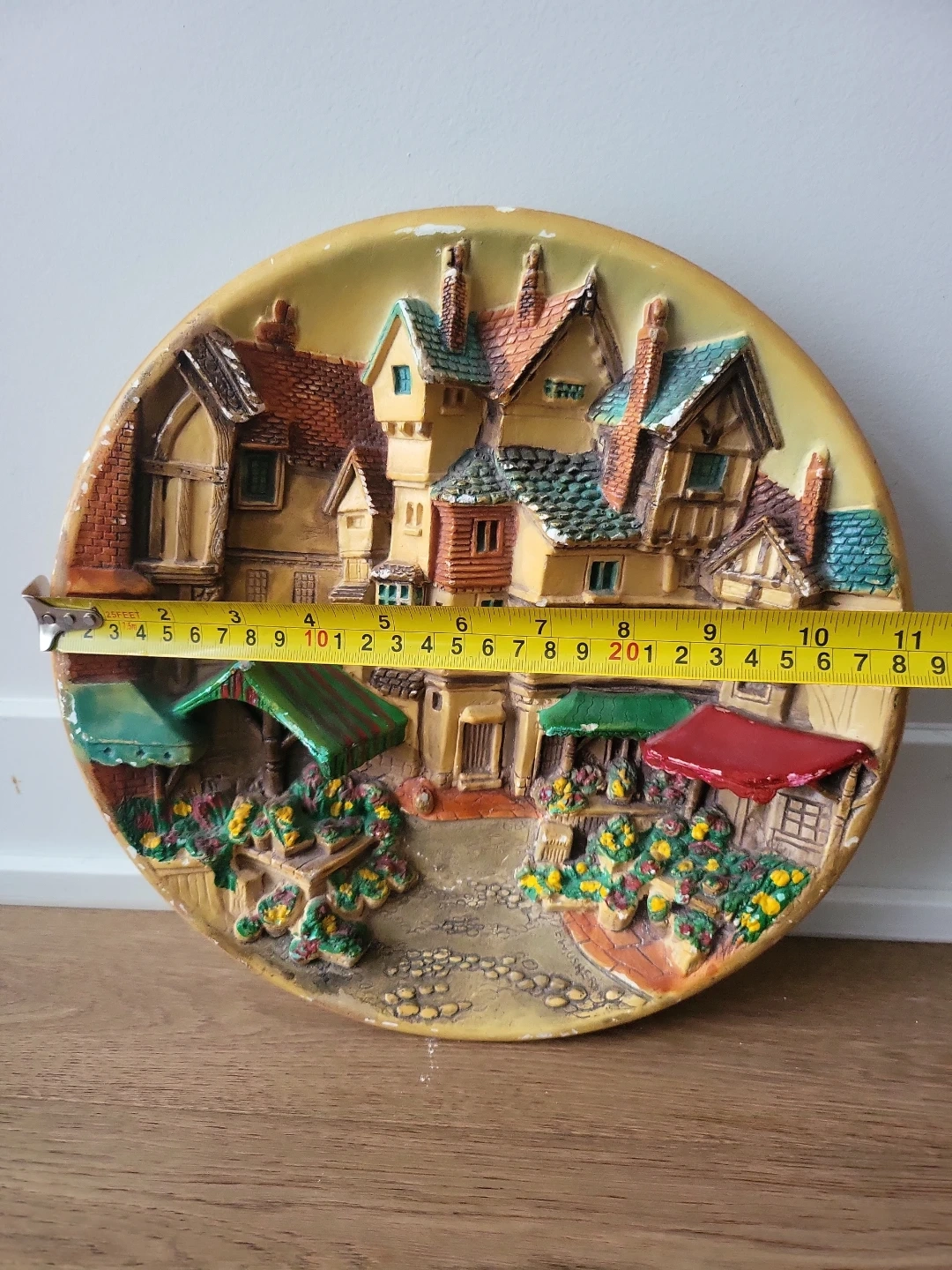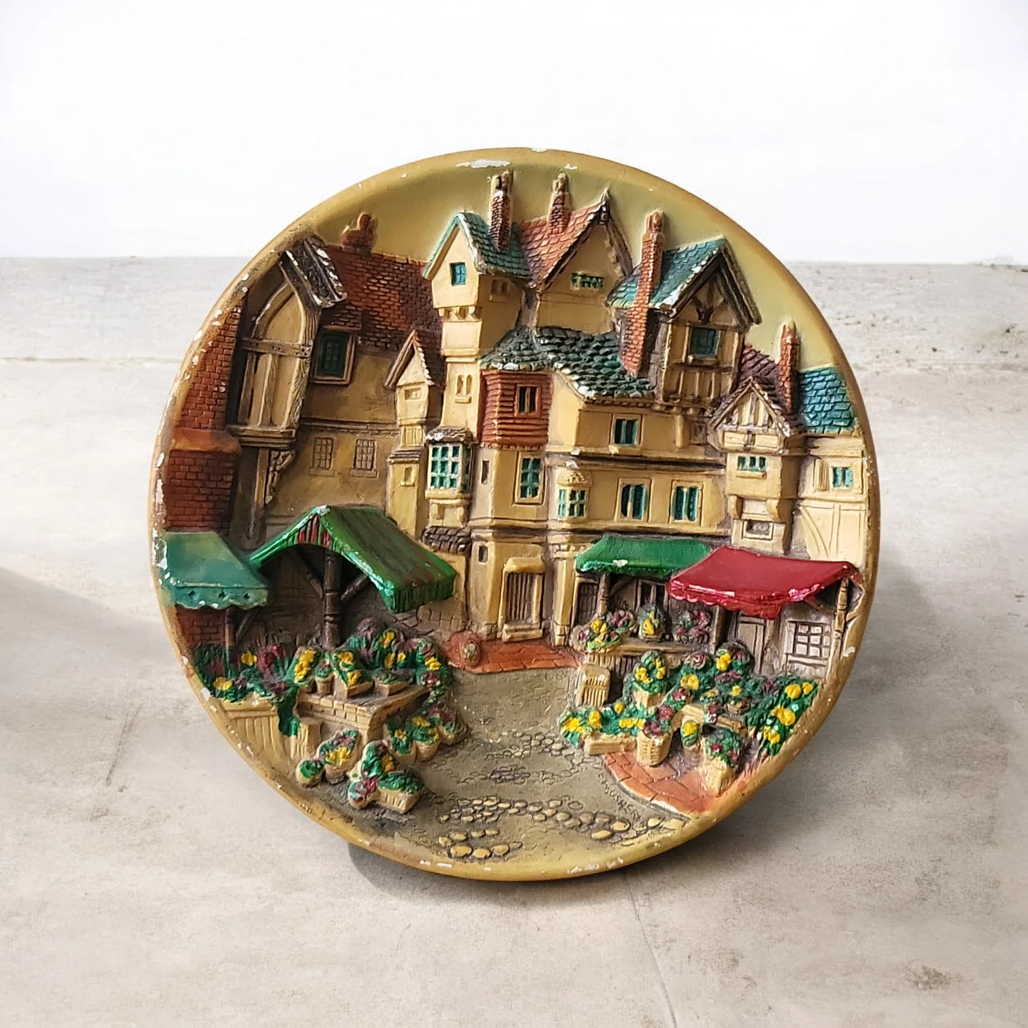 This is a charming vintage decorative wall plate featuring a detailed European town scene. It's perfect for adding a touch of old-world charm to any room. The plate is in good condition and ready to be displayed!