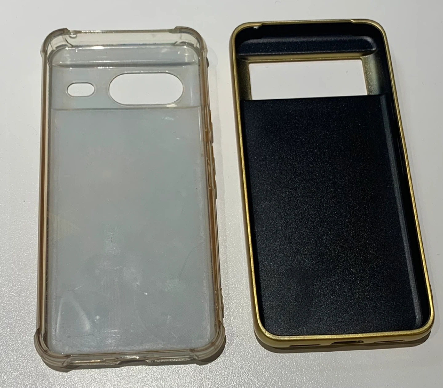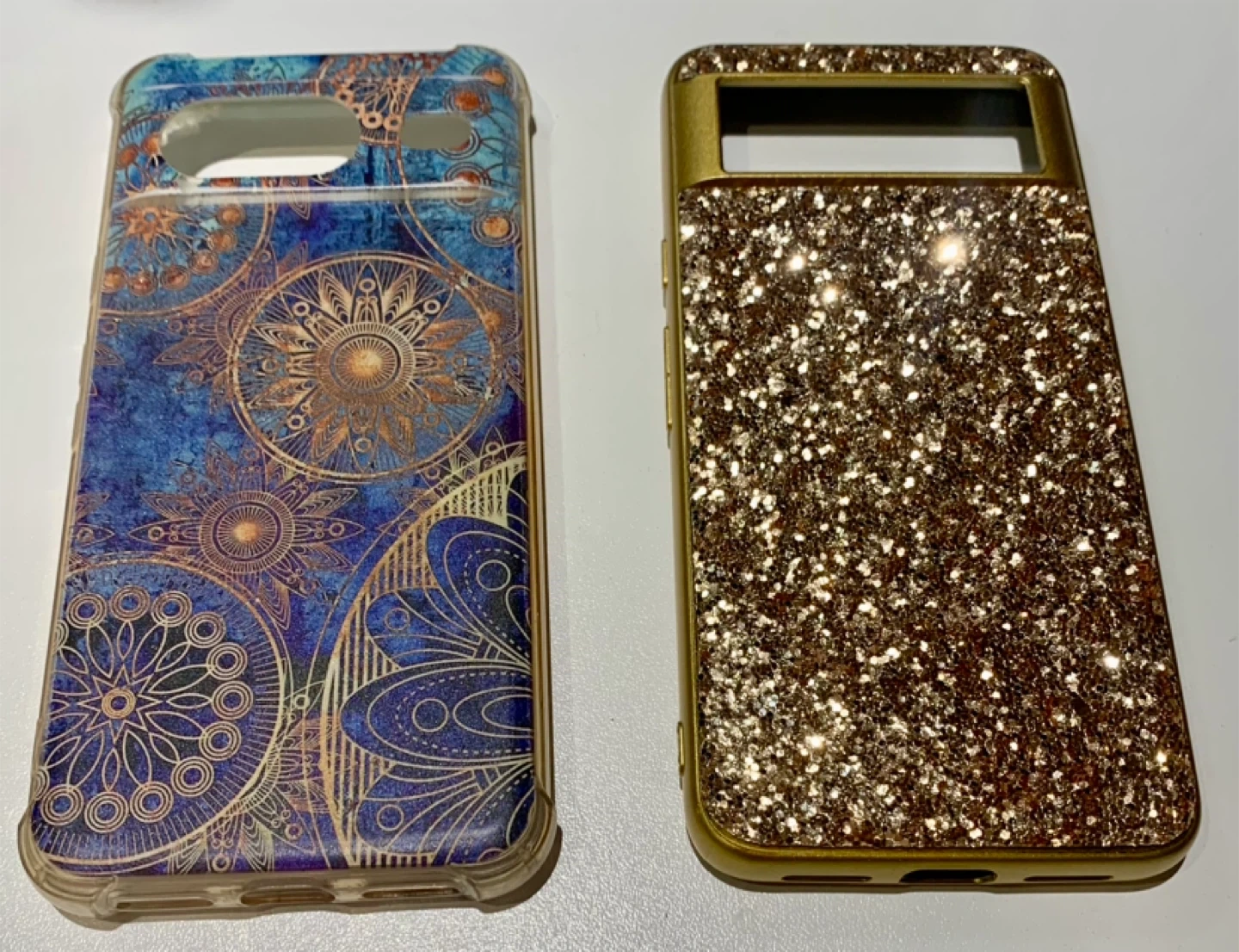 Selling two phone cases for the Google Pixel 8. One is clear with a mandala/ art nouveau feel and gold trim, the other is gold glitter with a black interior and gold trim. Both are in gently used condition and ready to protect your phone!