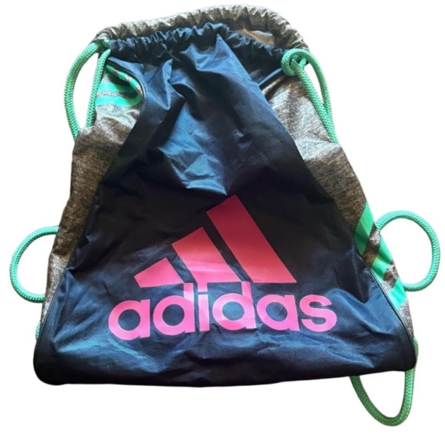 Grab-and-go convenience meets sporty style. This Adidas drawstring backpack features a bold pink logo, green cords, and lightweight build—perfect for gym days, errands, or casual outings. Dark blue body with grey panels