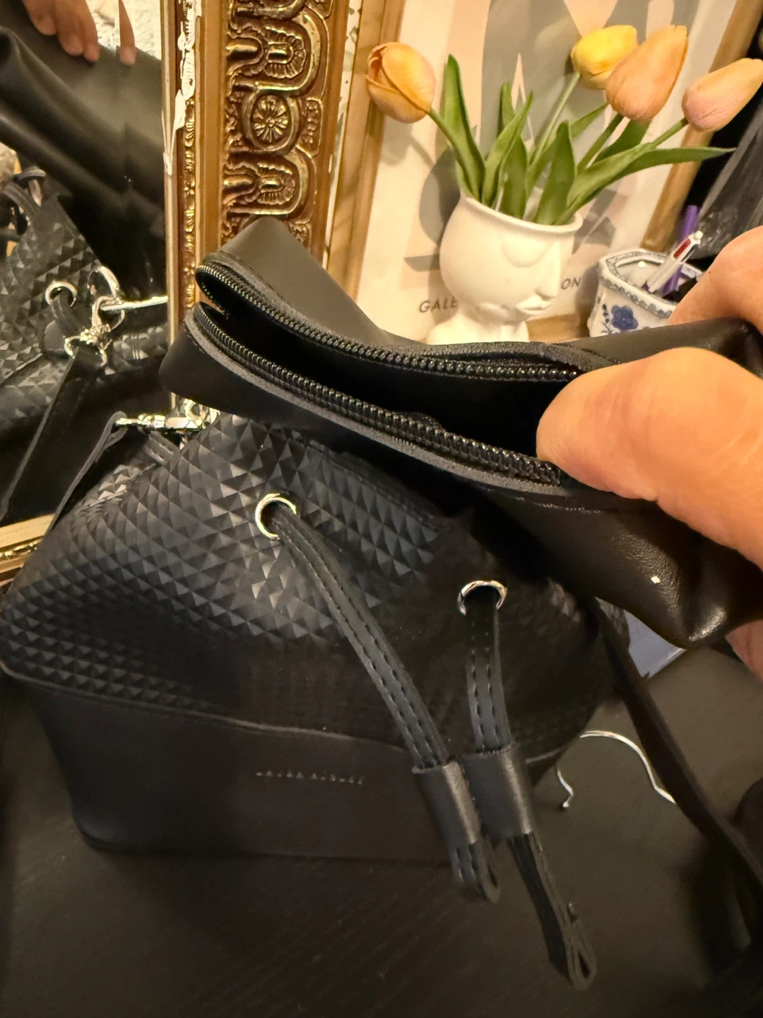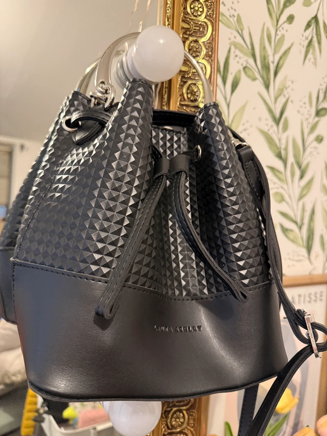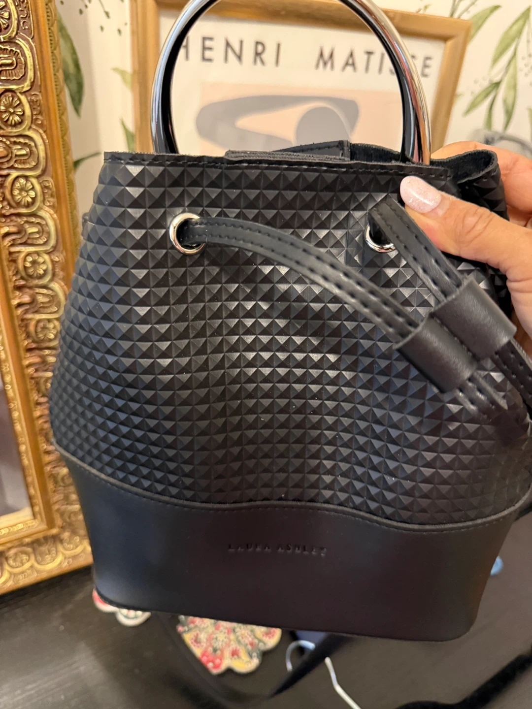 This is a cute Laura Ashley bucket bag in black. It has a unique textured pattern and a stylish metal ring handle. It's perfect for everyday use and is in great condition!
