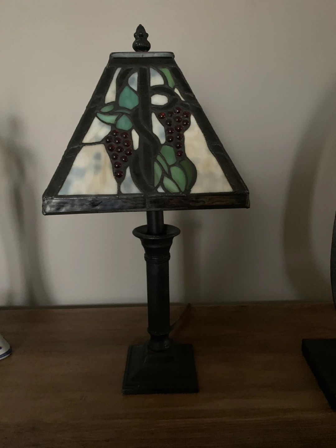 Selling a beautiful stained glass table lamp! It features a grape vine design with green leaves and red grapes on a white background. The base is a dark metal colour. It would look great in any room!