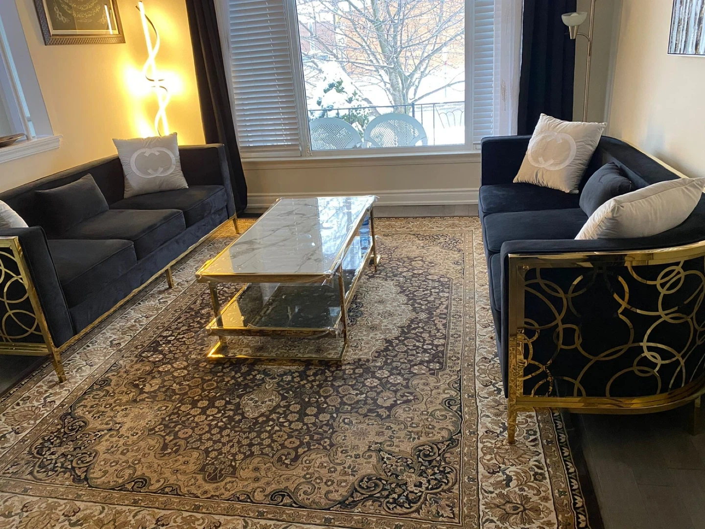 Selling a stylish black velvet sofa set with elegant gold trim. This set includes a sofa and a loveseat, perfect for adding a touch of luxury to your living space. The cushions feature a subtle design. It's in great condition and ready to enhance your home!