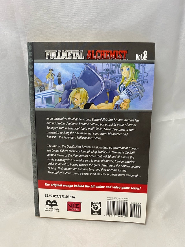 Dive into the captivating world of alchemy with "Fullmetal Alchemist, Vol. 8" by Hiromu Arakawa. This volume continues the enthralling journey of the Elric brothers as they seek the Philosopher's Stone to restore what they've lost. With its blend of action, emotion, and mystery, this series has become a cornerstone of the manga tradition. Published in the United States, this English-language edition is a must-have for fans and collectors alike. Each page of this single volume is a testament to the artistry and storytelling prowess of the Fullmetal Alchemist series. Whether you’re a long-time follower or new to the saga, this book promises to be a cherished addition to any manga library.