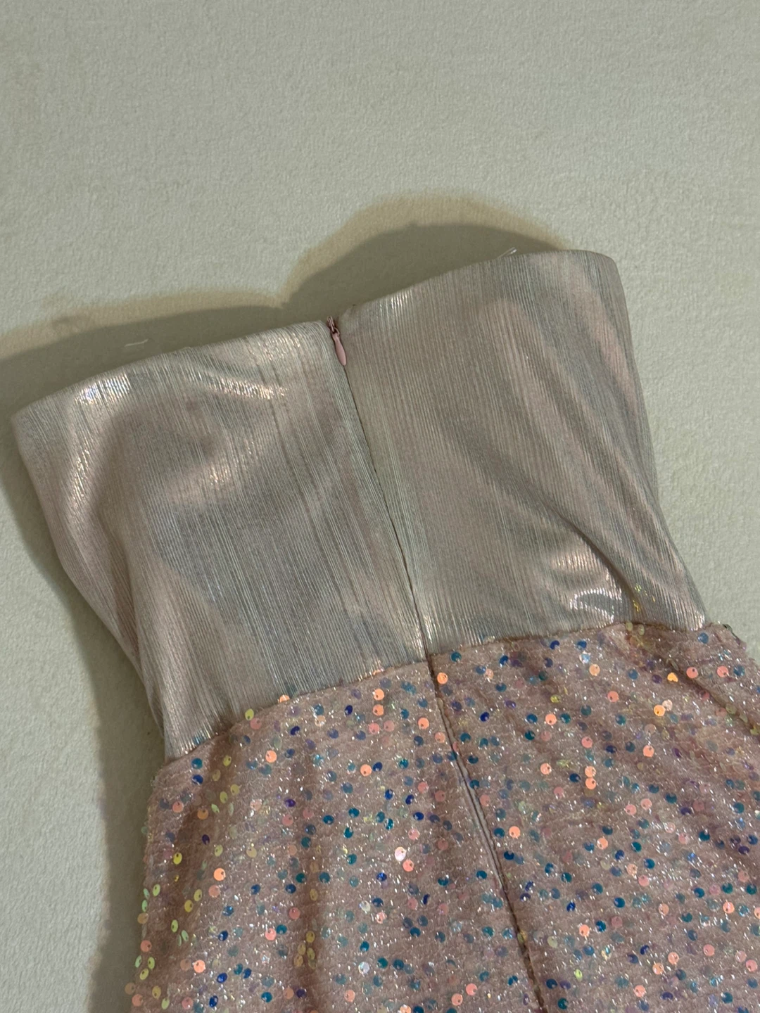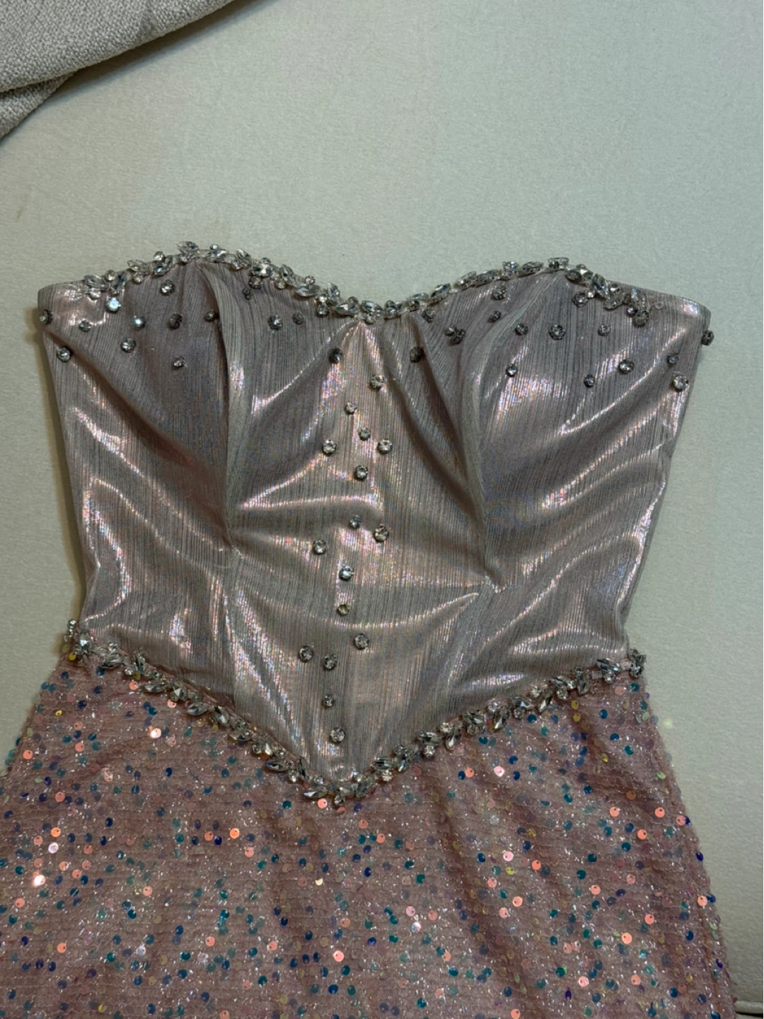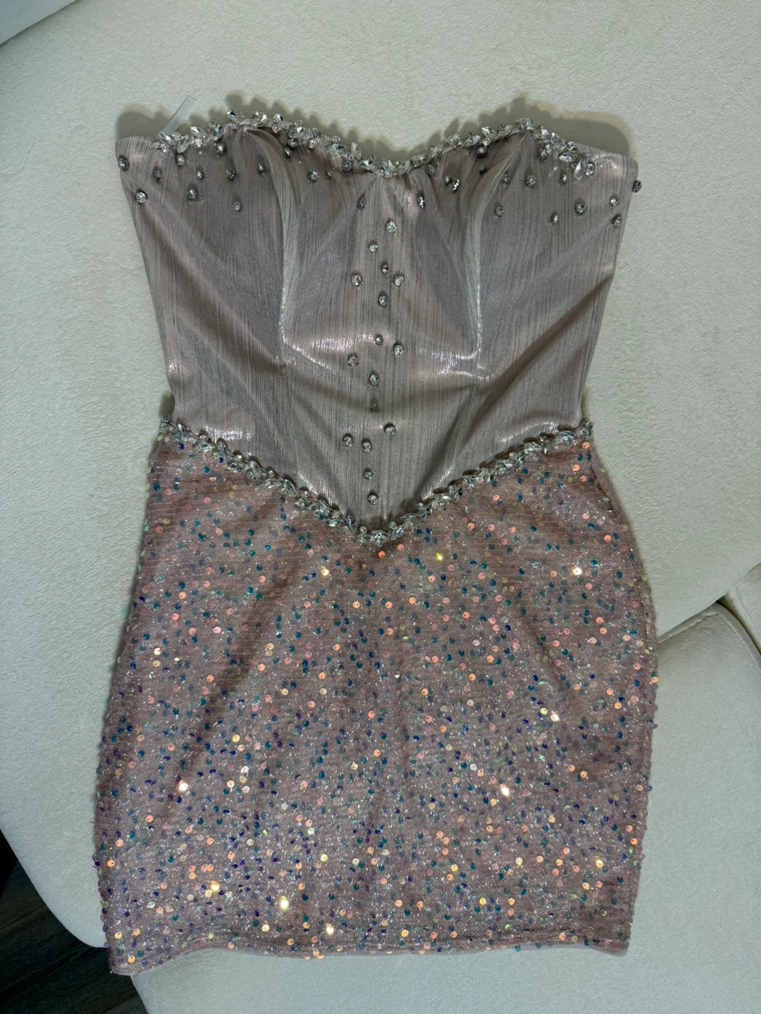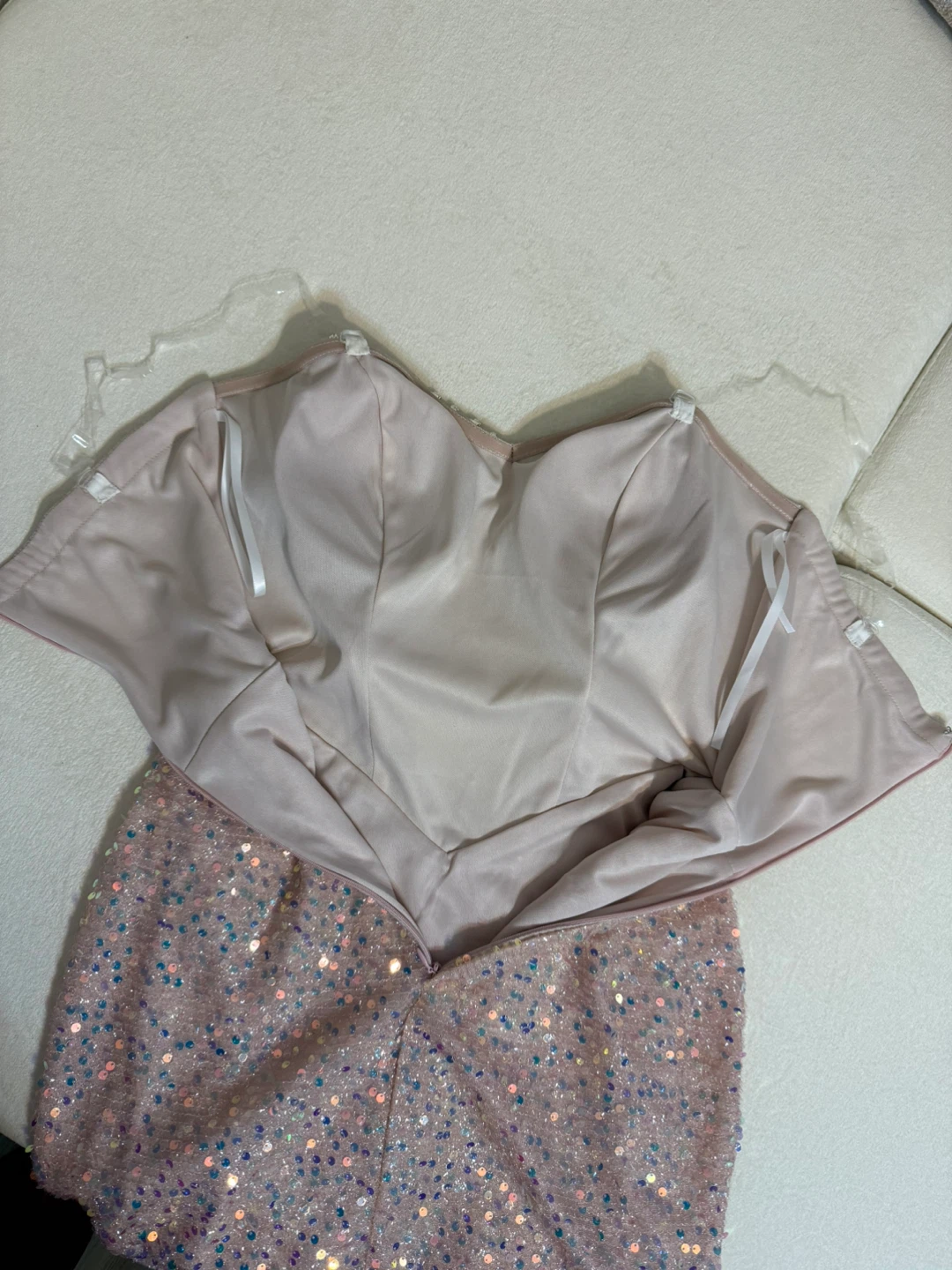 Selling a cute sequin mini dress in size small. It features a strapless design with shimmering sequins throughout. Perfect for a night out!