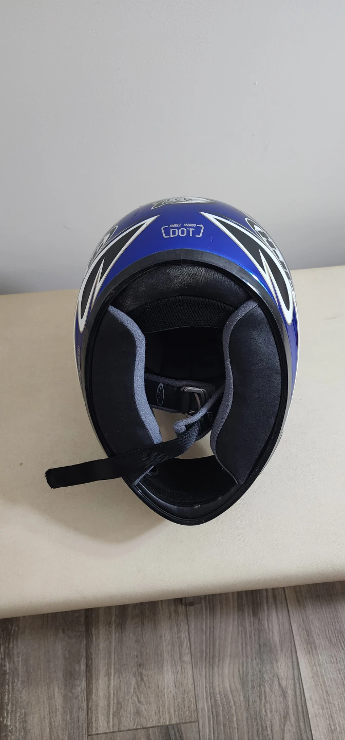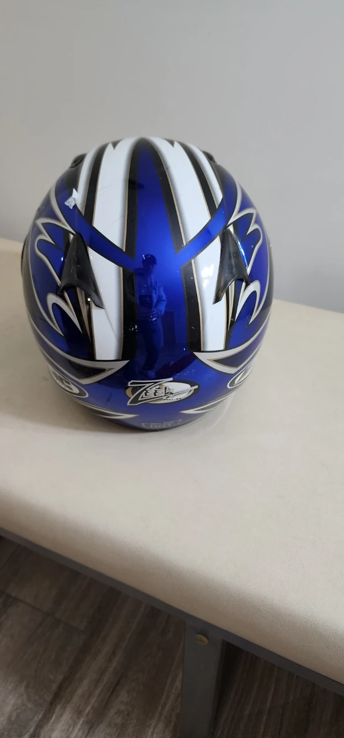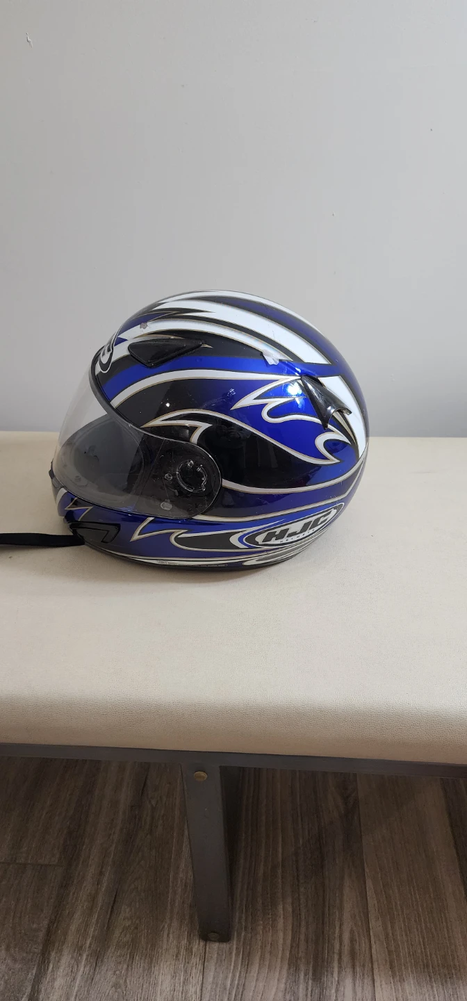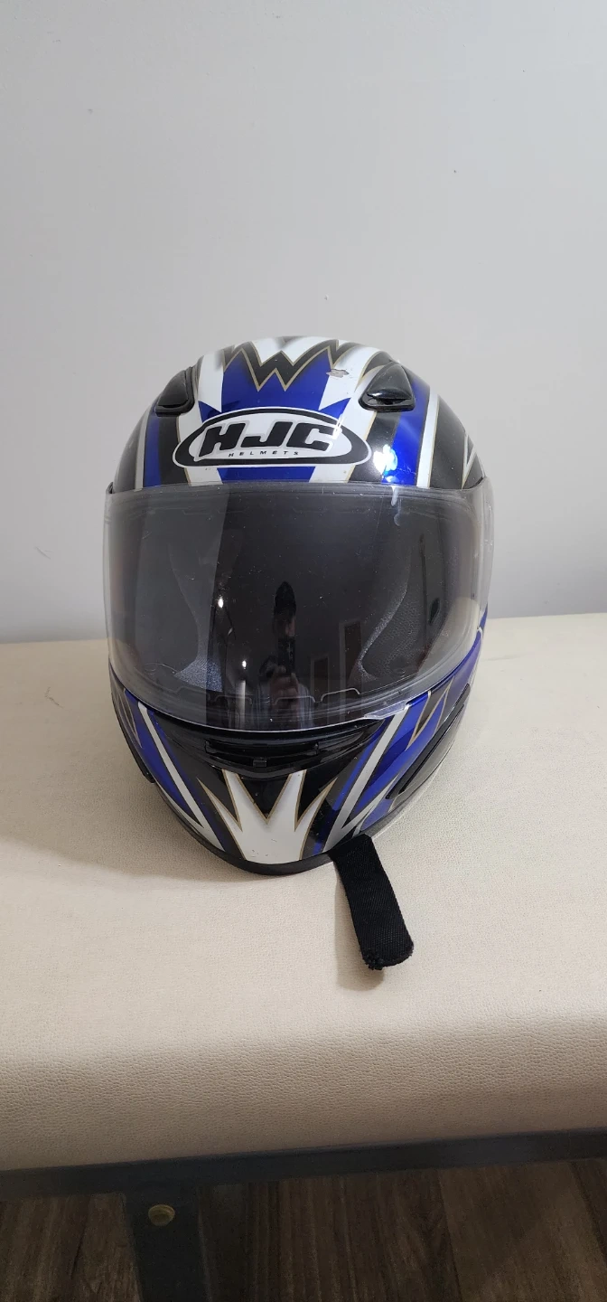 Selling a used HJC motorcycle helmet. It's blue and white with a dark visor. It has some signs of wear but is still in usable condition.