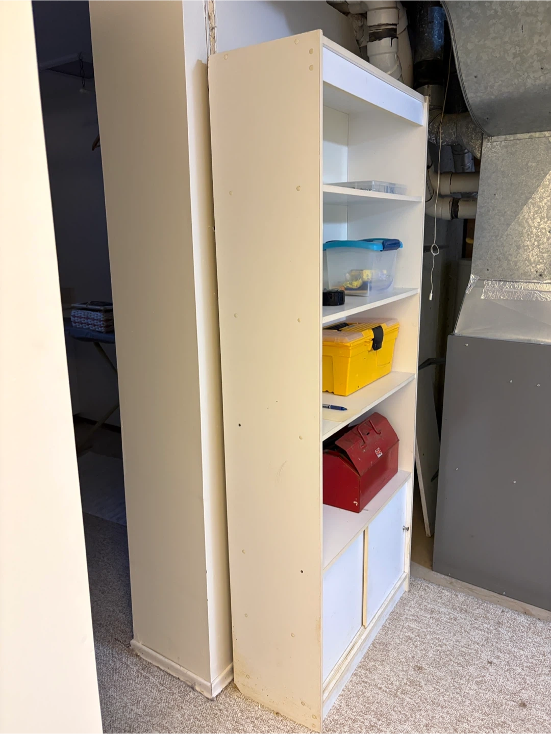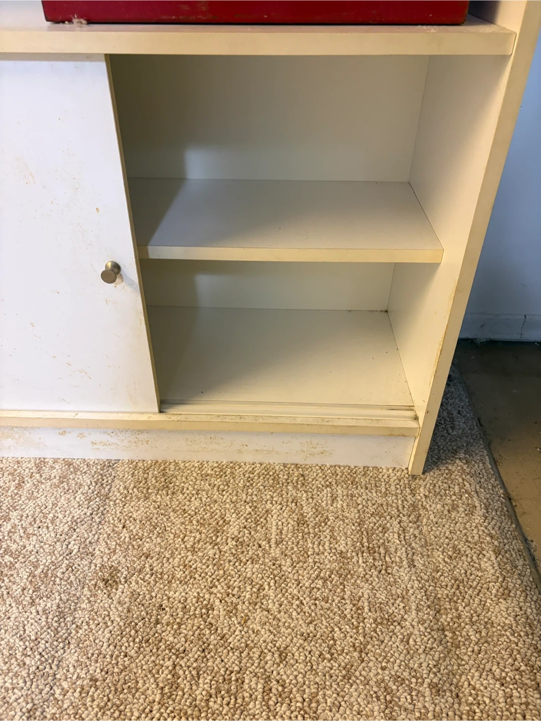 Selling a white bookshelf with sliding doors at the bottom. It has some wear and tear, but it's solid and still functional and has lots of storage space. Great for organizing books, tools, or anything else you need to store