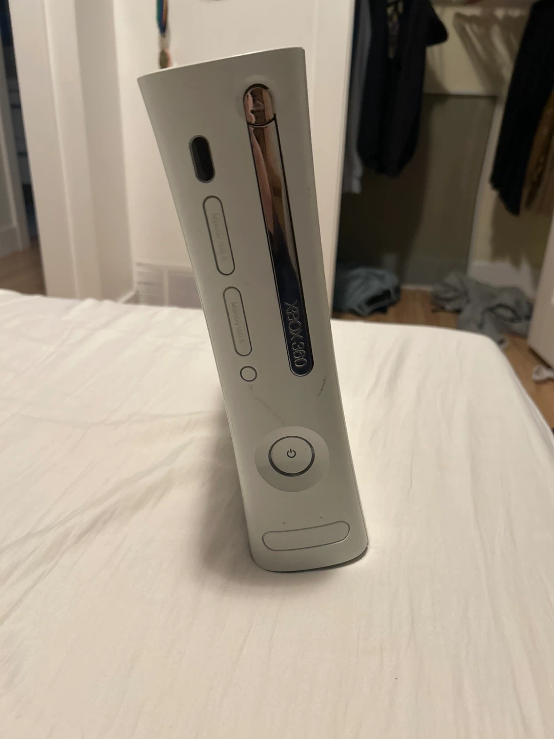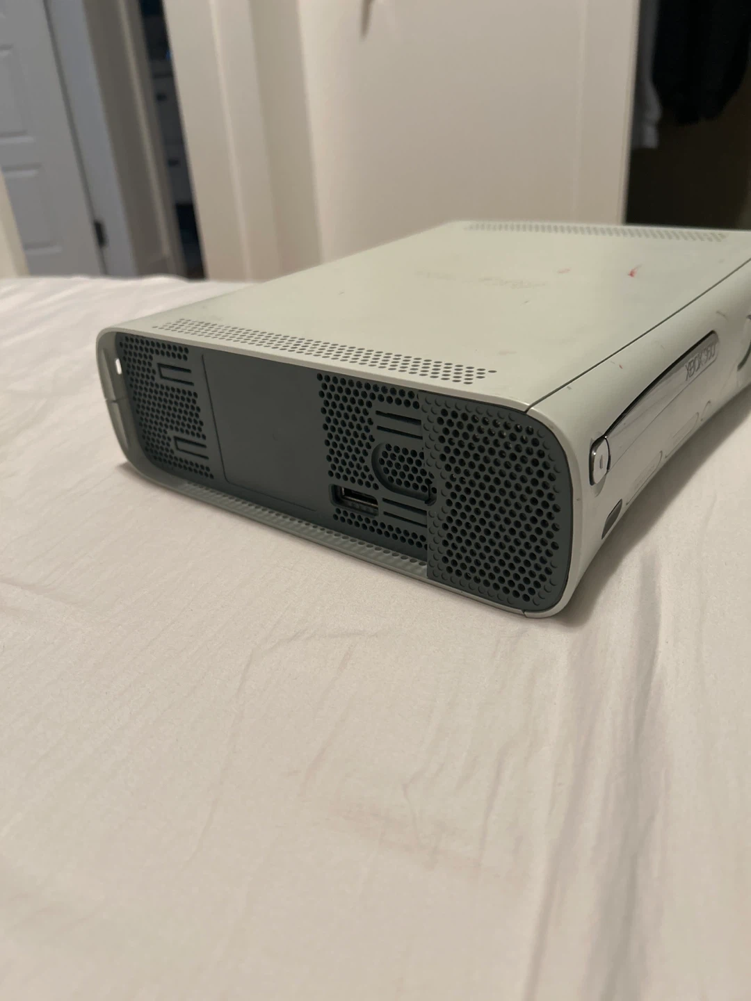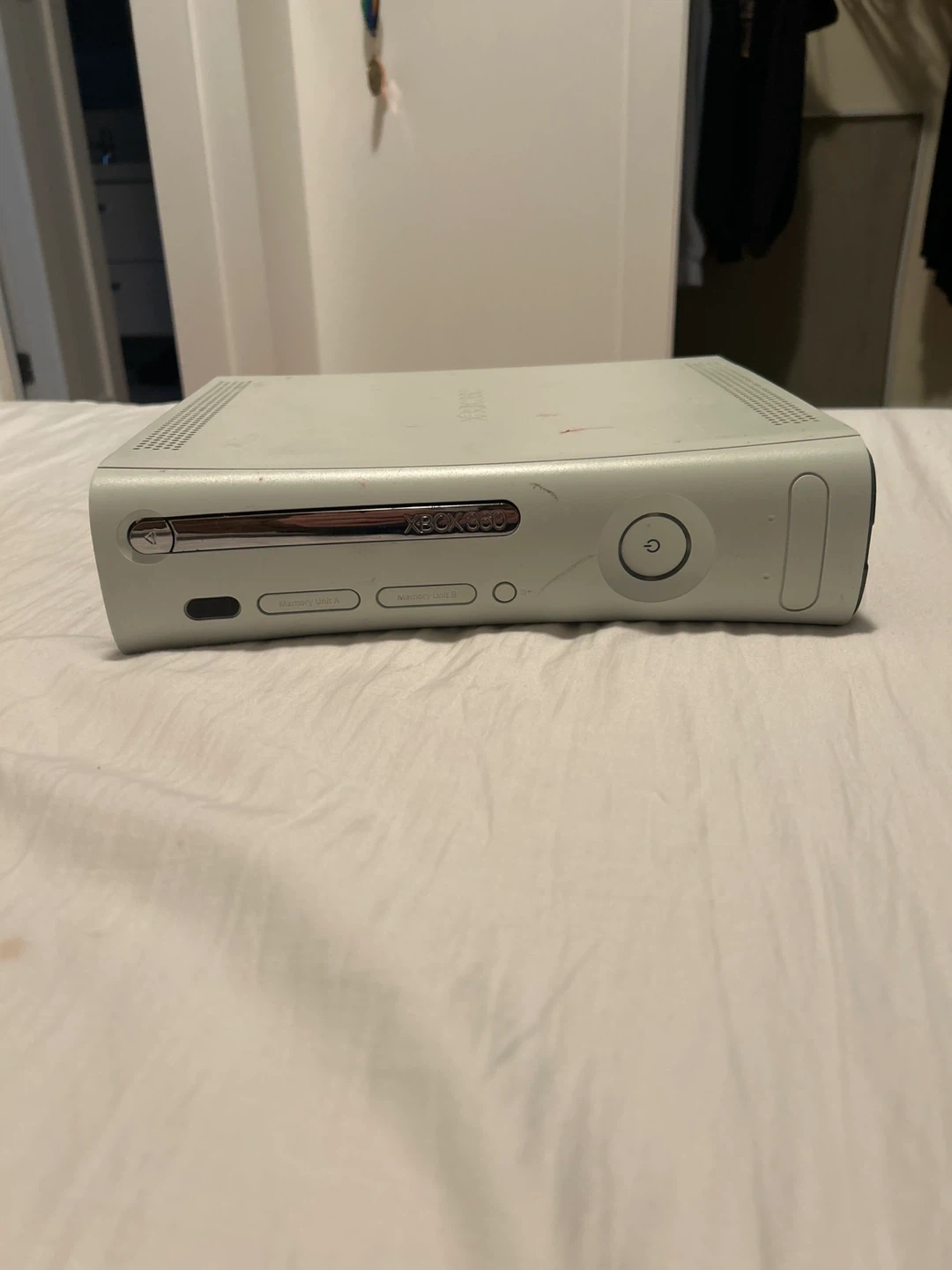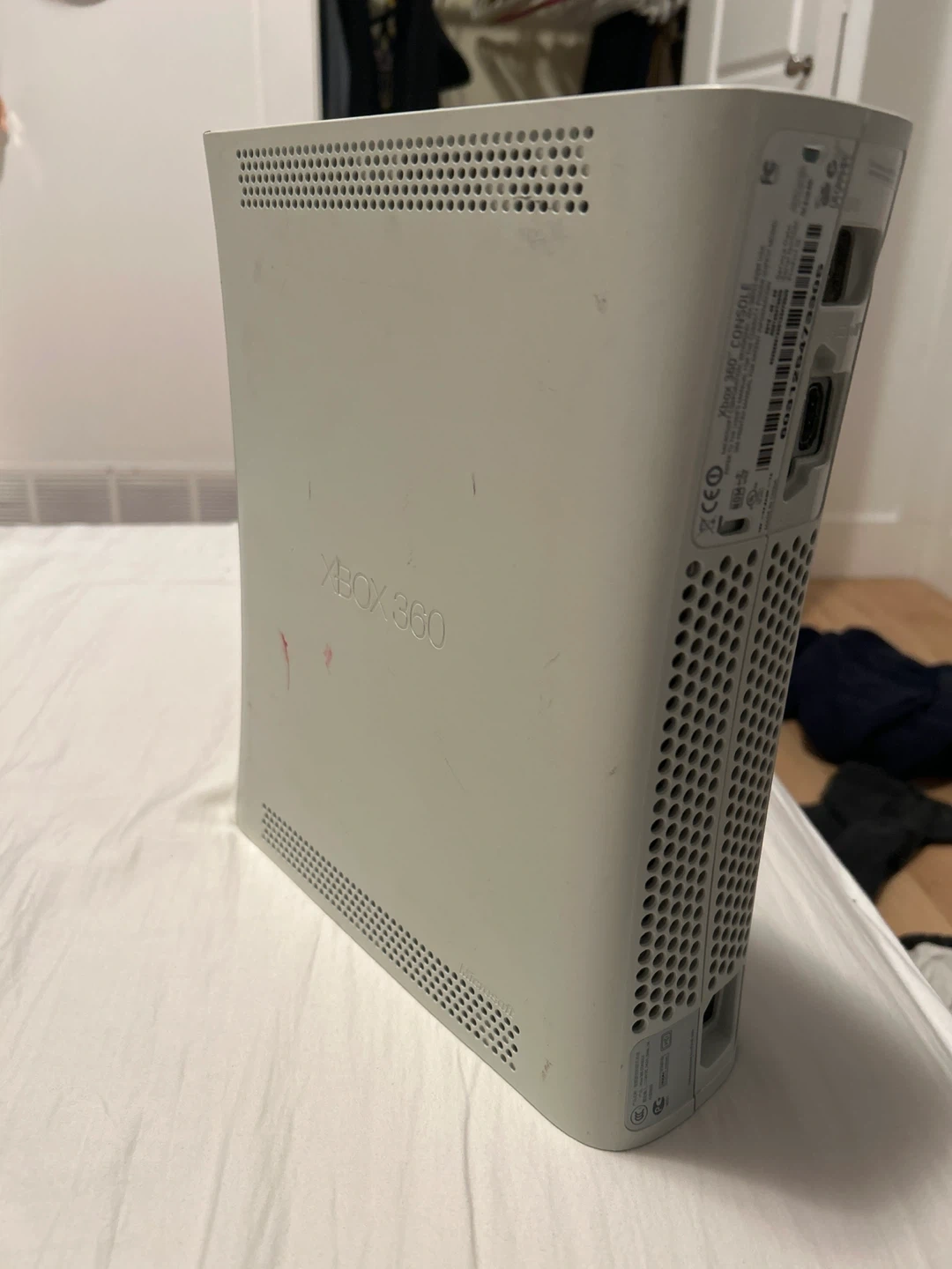 Selling an Xbox 360 console. It has some signs of use, like some scratches and marks, but it's still in good working condition and ready for a new player!
