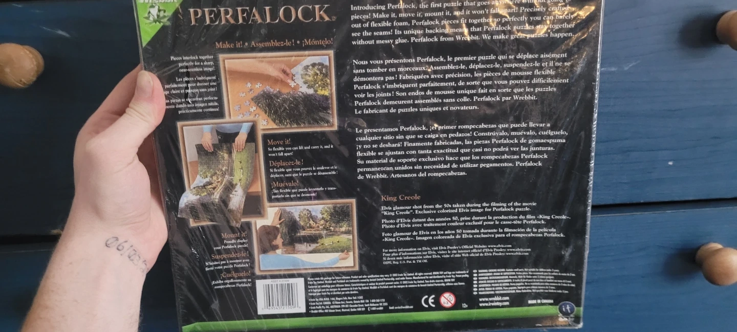 I'm selling a brand new, sealed 1000-piece jigsaw puzzle featuring Elvis Presley! It's called "King Creole", a photo of Elvis taken during the filming of the movie. It's a Perfalock puzzle, which means the pieces fit together seamlessly without messy glue