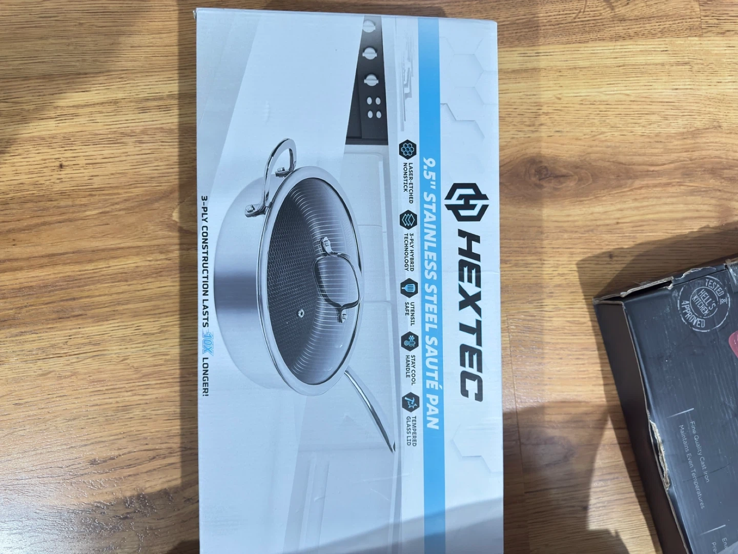 Selling a HEXTEC 9.5" stainless steel sauté pan. It features laser-etched nonstick technology, a 3-ply hybrid construction, and is utensil safe. It also has a stay-cool handle and a tempered glass lid. The 3-ply construction lasts 10x longer!