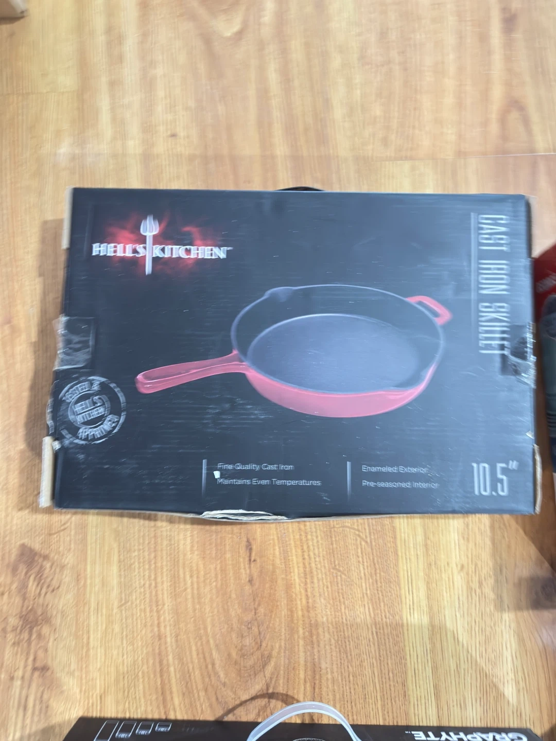 Selling a Hell's Kitchen cast iron skillet! It's 10.5 inches and made of fine quality cast iron that maintains even temperatures. It also has an enameled exterior and pre-seasoned interior. The box is included!