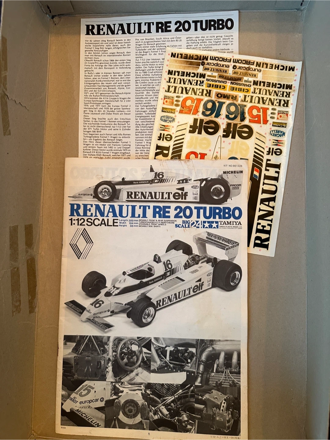 Selling original 1981 release of the Renault RE 20 Turbo 1:12 scale model kit by Tamiya. Parts and stickers are included with manual in excellent condition.