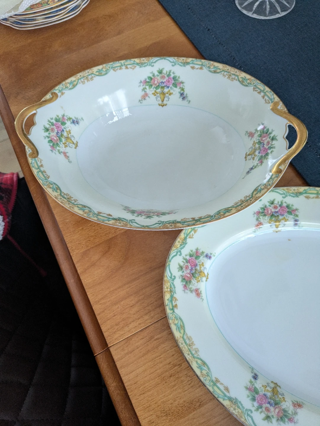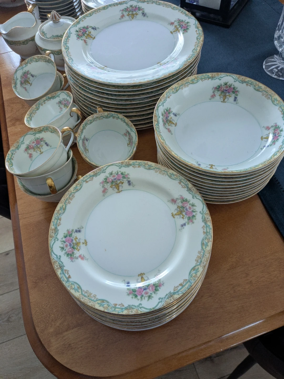 Selling a beautiful vintage china set with a delicate floral pattern and gold trim. This set includes plates, bowls, cups, saucers, and serving dishes. It's perfect for adding a touch of elegance to your dining experience! Noritake Arvana China - 12 piece place setting includes dinner plates, bread and butter plates, dessert bowls, teacups, saucers, soup bowls, gravy boat, 2 serving bowls with lids, sugar bowl, creamer, large platter, medium platter, small platter and medium serving bowl. 2 teacups damaged. Minor chips.