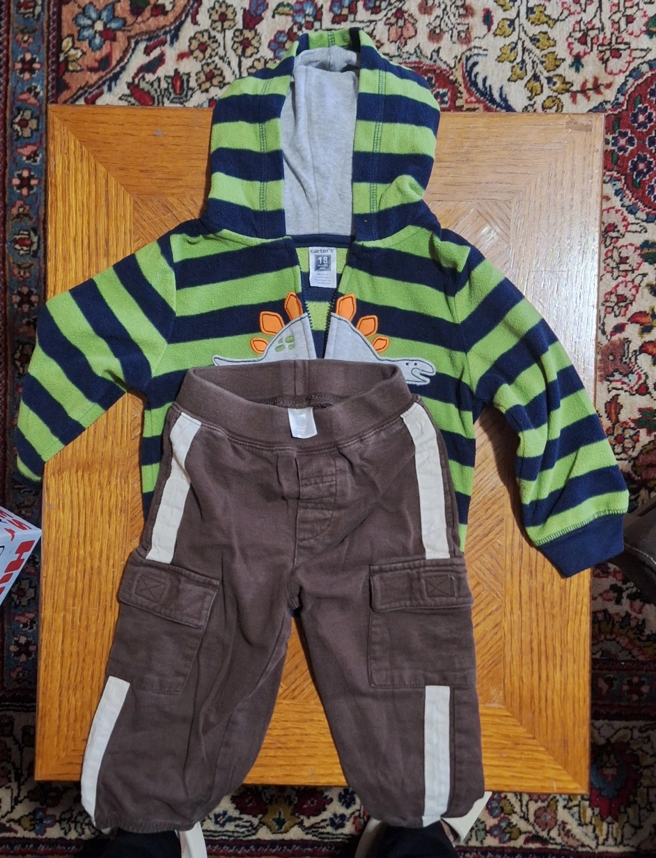 A cute Carter's outfit for your little one! It includes a striped hoodie with a dinosaur design size 18 months and Carter's brown cargo pants with white stripes. Size 12 months, perfect for a growing baby