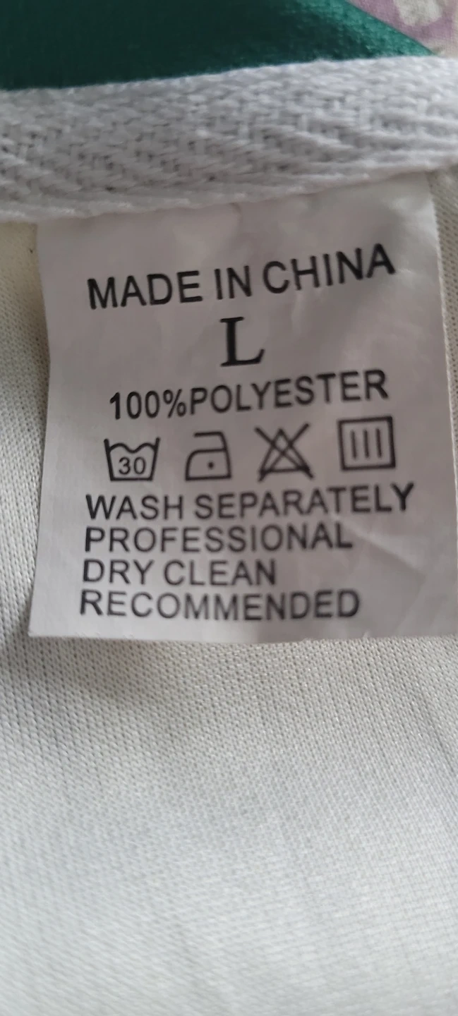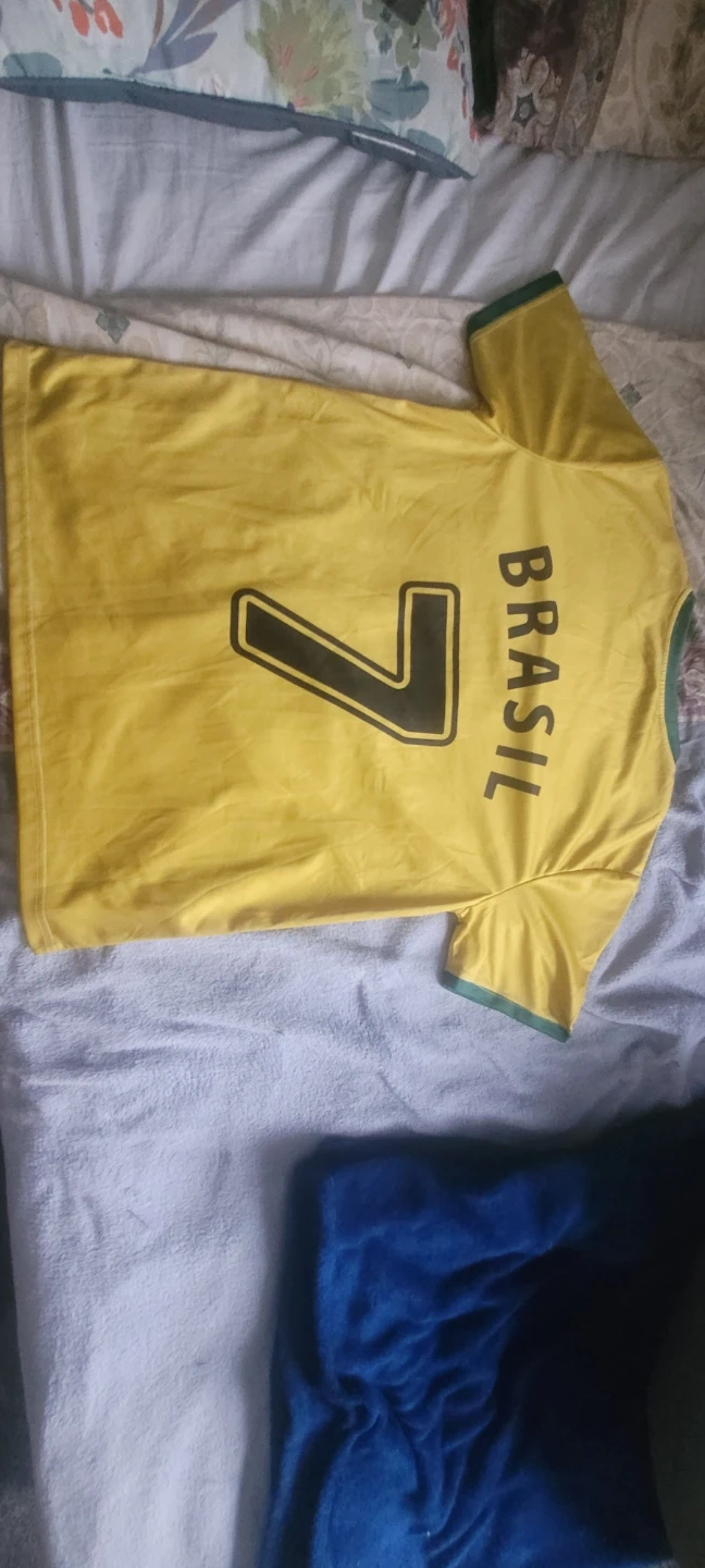 Selling a Brasil soccer jersey in size L. It's made of 100% polyester and features the Brasil logo. The back has the number 7 and the word Brasil. It's recommended to wash it separately and professionally dry clean