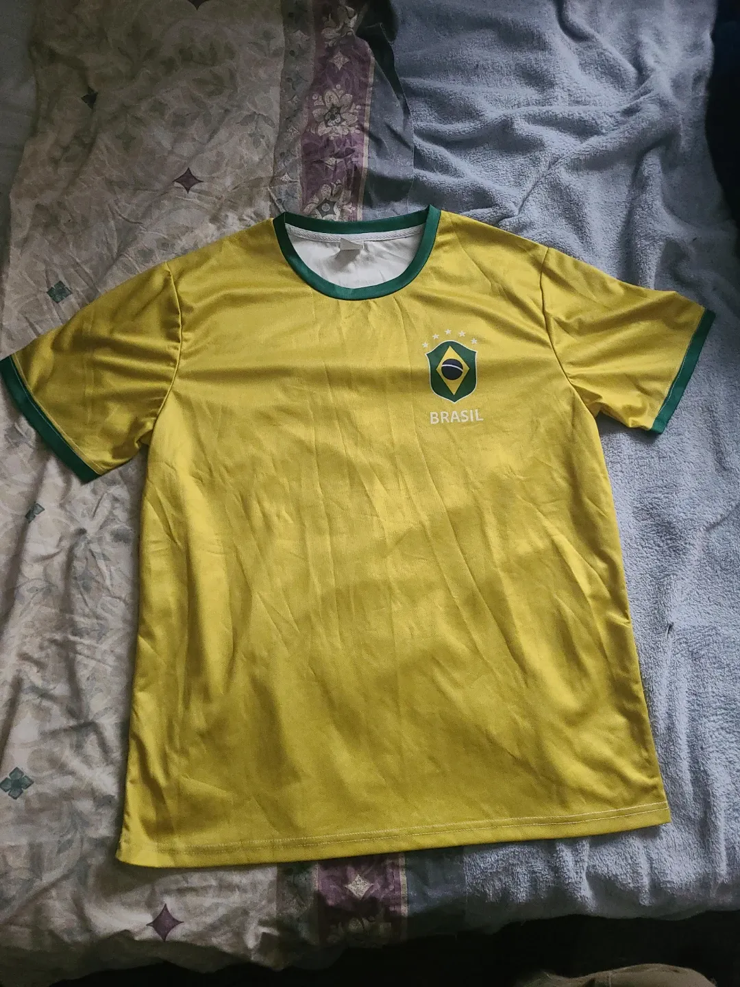 Selling a Brasil soccer jersey in size L. It's made of 100% polyester and features the Brasil logo. The back has the number 7 and the word Brasil. It's recommended to wash it separately and professionally dry clean