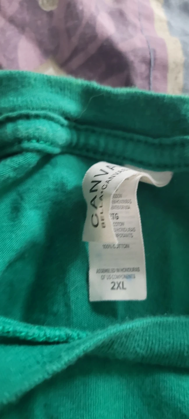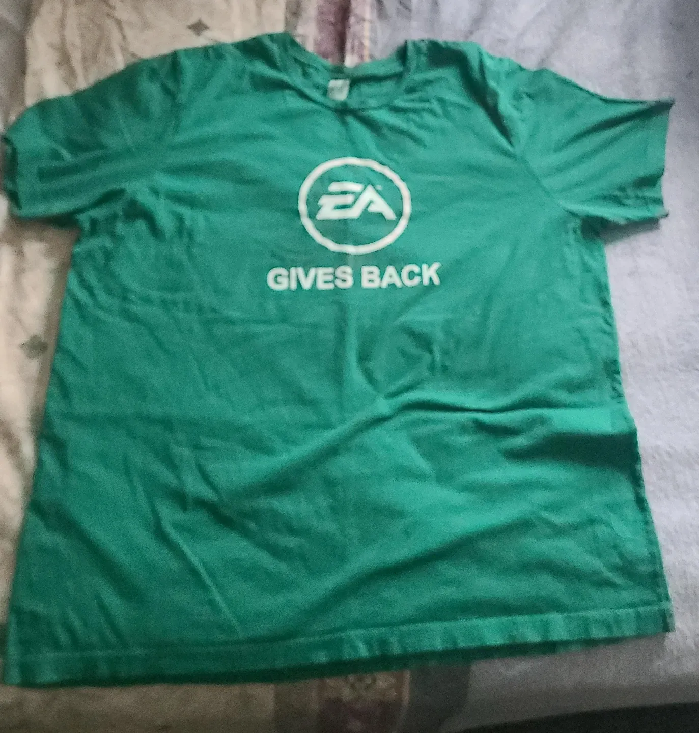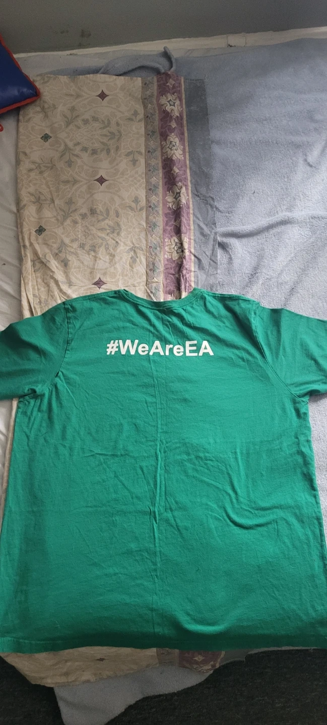 I'm selling a green t-shirt from Bella+Canvas. It's a size 2XL and features the EA Gives Back logo on the front and #WeAreEA on the back. It's made of 100% cotton and is in great condition with just one black paint stain on the front.