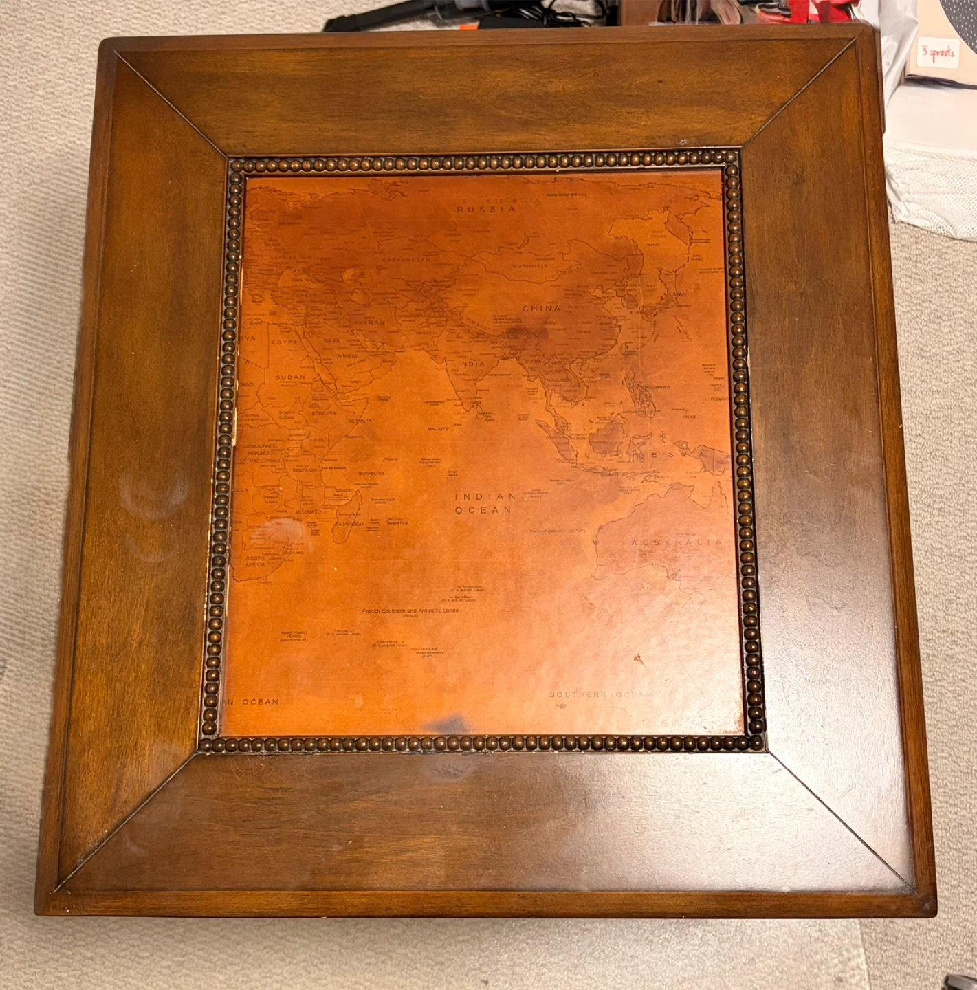 This is a beautiful accent table featuring a world map design on top. It's in great condition and would be a lovely addition to any room. The table has a wooden frame with a dark brown finish, adding a touch of elegance to your space. Two side tables are available for sale. ($10 each)