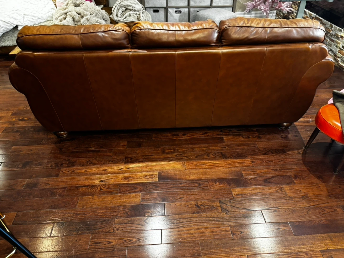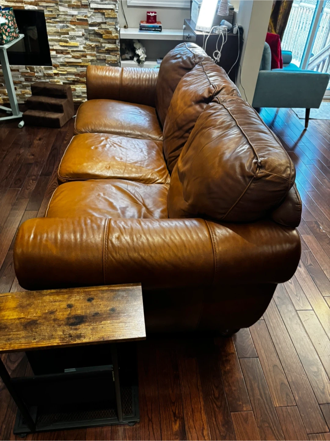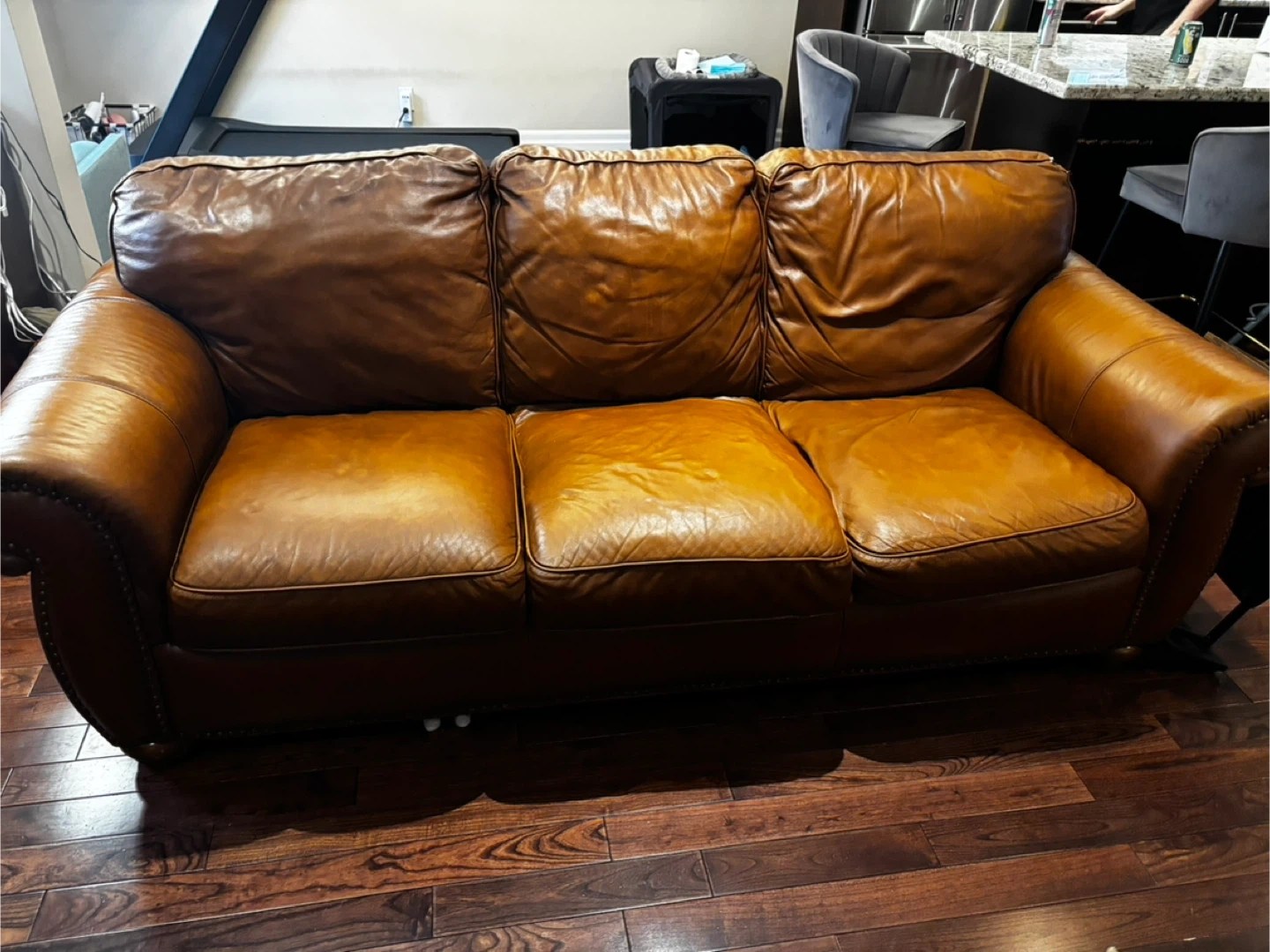 Selling a comfortable three-seater sofa with a classic brown leather finish. It's a great addition to any living room, providing both style and comfort. The sofa shows some signs of use, which adds to its vintage charm. It's perfect for relaxing after a long day or entertaining guests!