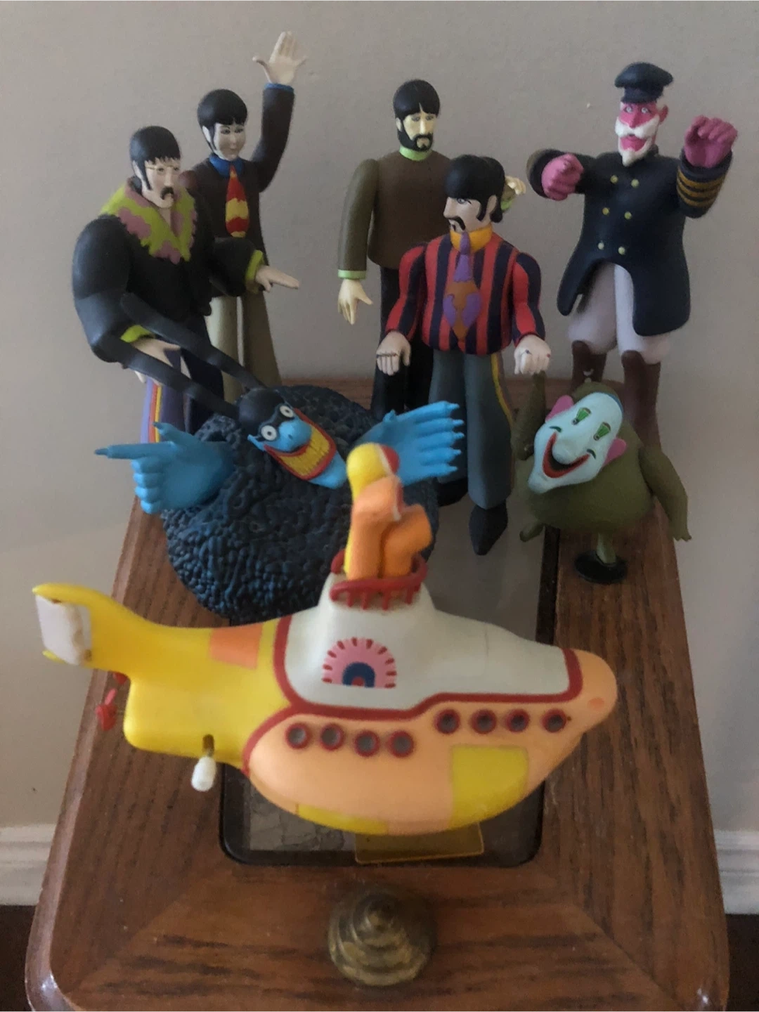 Selling a The Beatles Yellow Submarine figurine set! It includes the submarine and all the members of the band, plus some other characters from the movie. Great for any Beatles fan! 8 peices in all