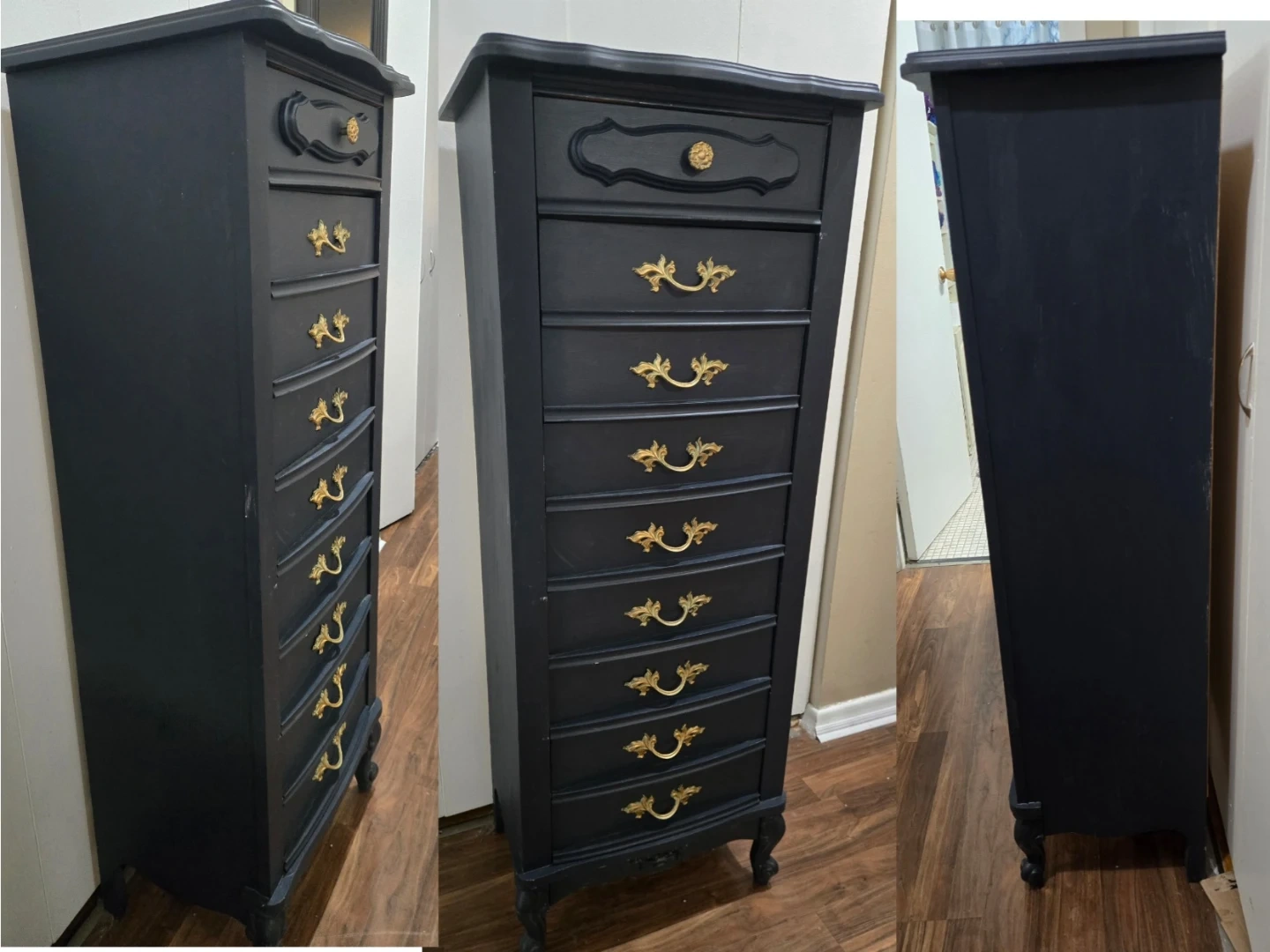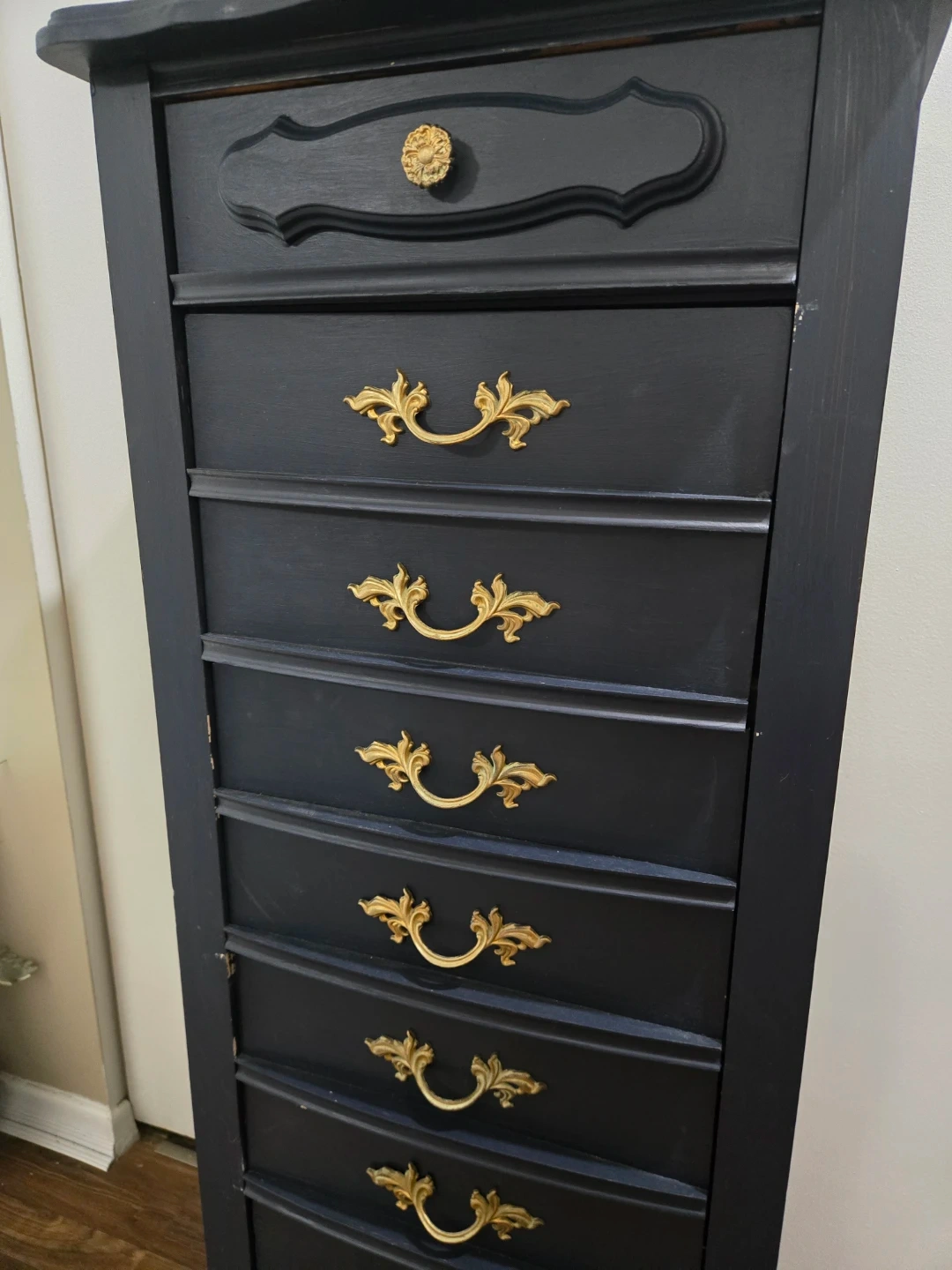 Tall 5 drawer lingerie dresser. 4 deep (double drawer) w/ 2 gold pulls on each drawer & 1 smalle top drawer w/ knob pull.