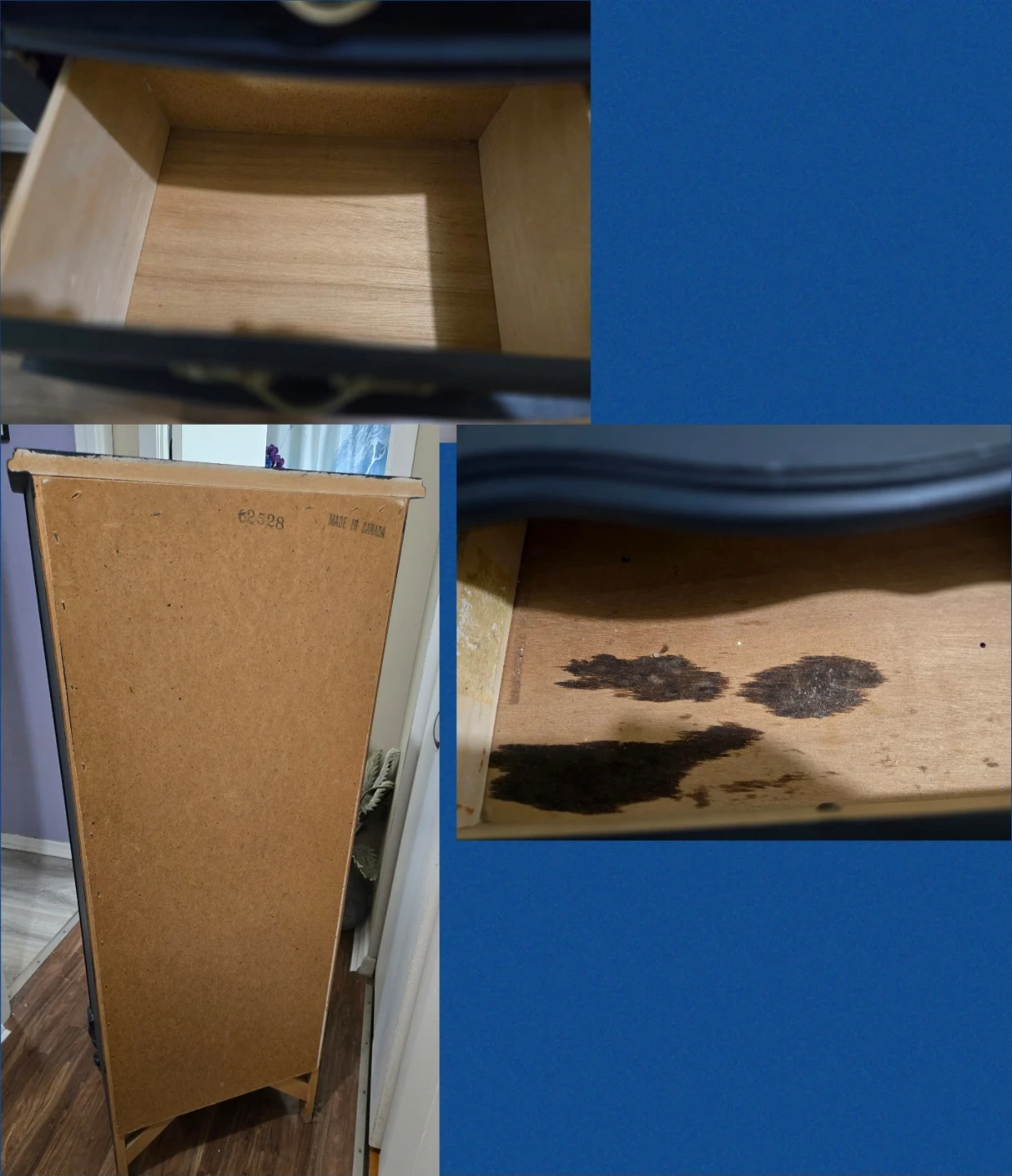 All drawers work & stay solid on track when opened. There is no damage of any kind. Just a few very minor paint touch ups. I will include some touch-up paint.