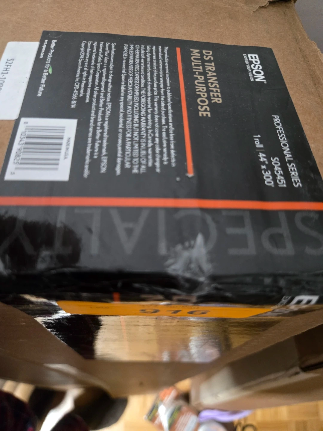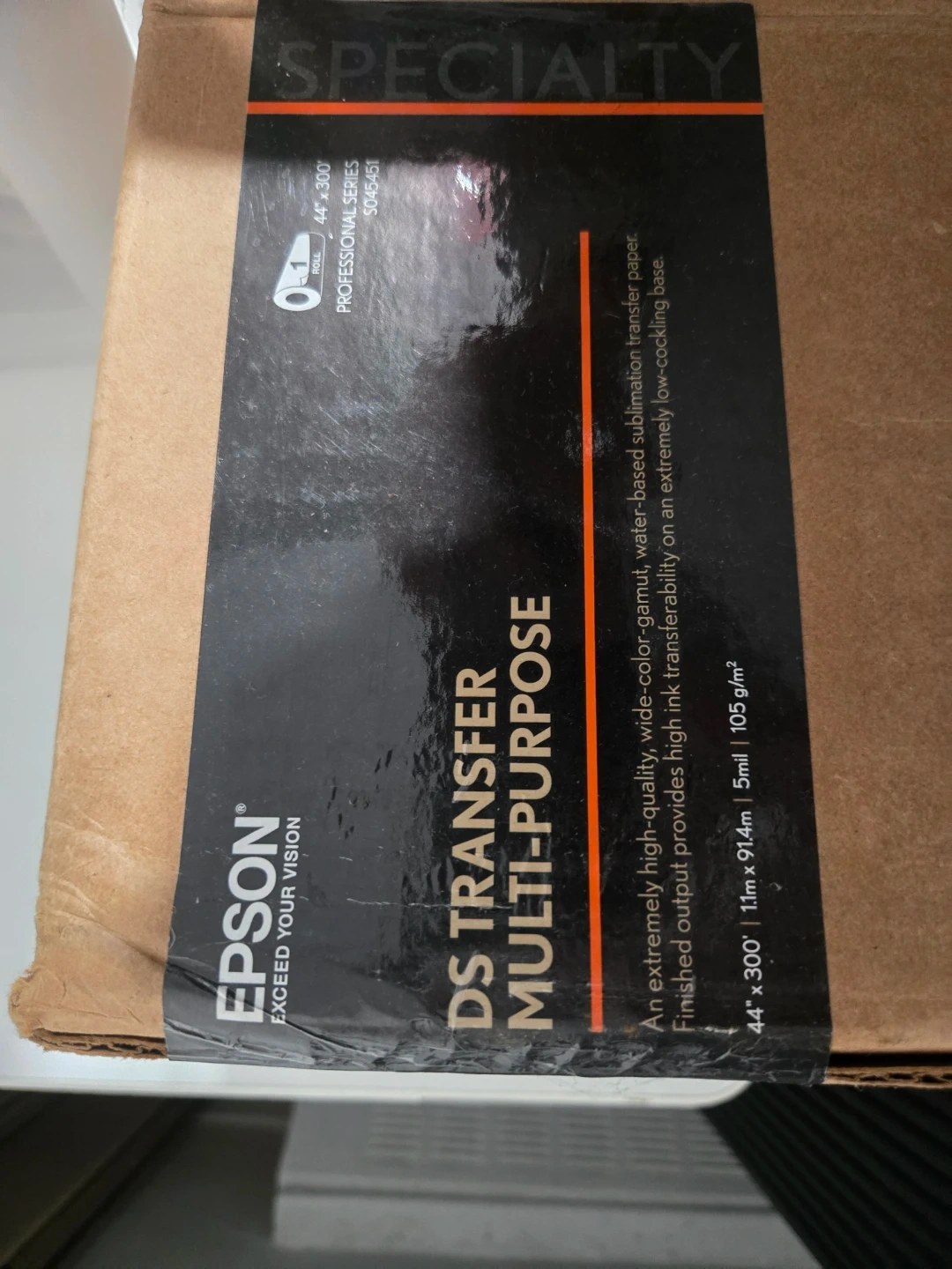 Selling a roll of Epson DS Transfer Multi-Purpose paper. It's a professional series 5045451, sized at 44" x 300'. This high-quality, wide-color-gamut, water-based sublimation transfer paper is perfect for high ink transferability on an extremely low-cockling base. Finished output provides high ink transferability at 1.1m x 91.4m, 5mil / 105 g/m²
