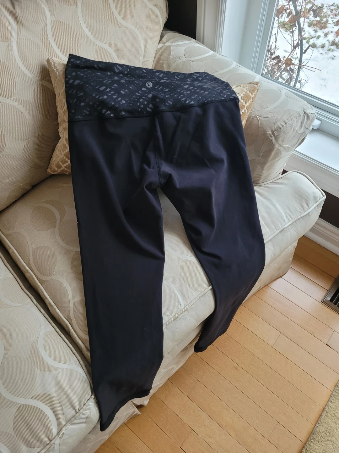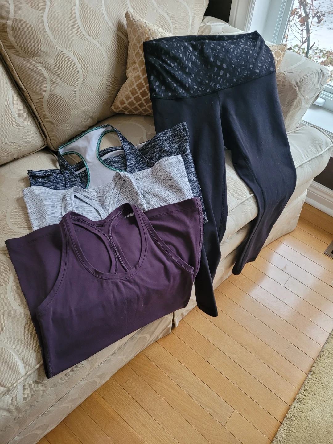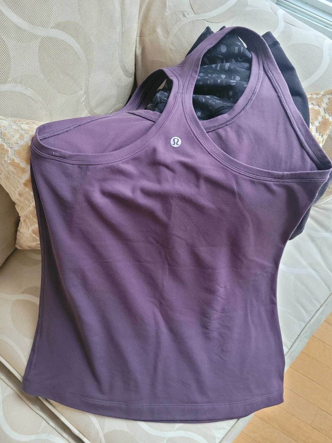 Selling 3 Lululemon tank top and leggings. The tank tops colour plum, Grey fleck black & grey fleck, the leggings are black with a patterned waistband. All items have been use but are in good condition size 8. Freshly washed ready to wear. Selling as bundle lot, sorry not separately.