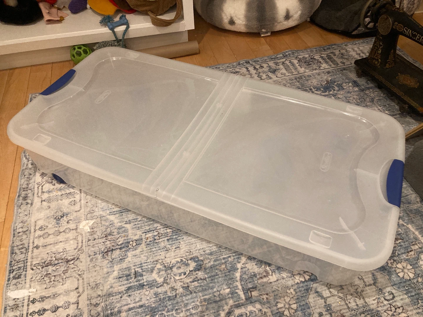 Selling a Sterilite under bed wheeled storage box! It's great for storing items under the bed and keeping your space organized. It's in good condition and ready to help you declutter
