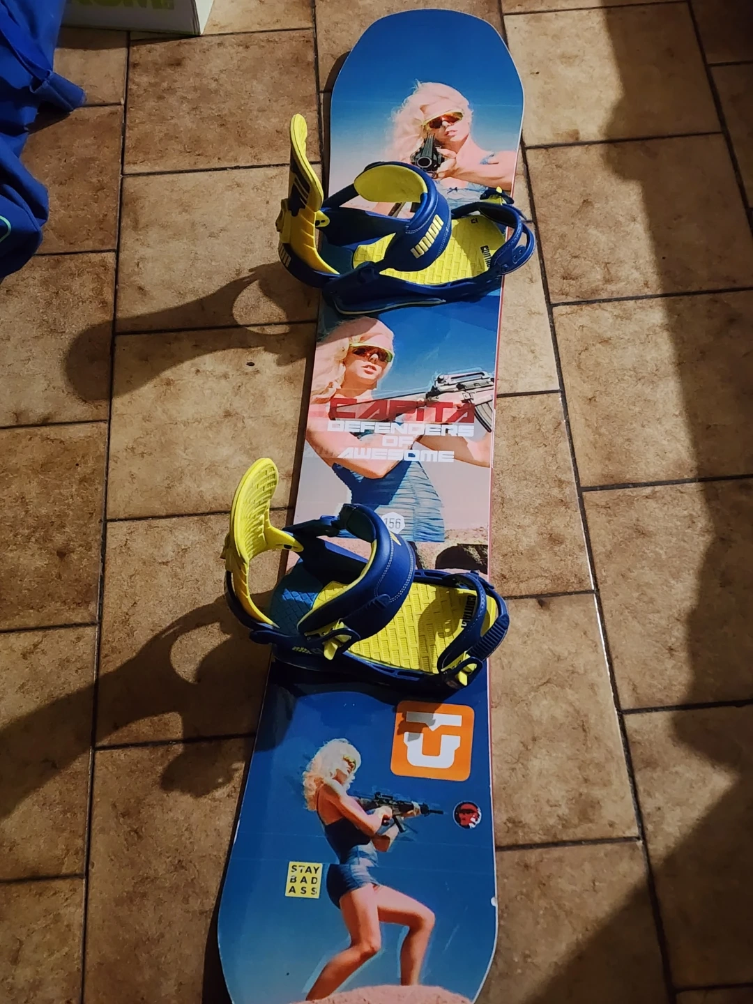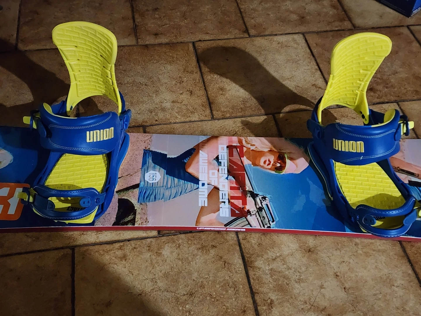 Selling a Capita Defenders of Awesome snowboard, size 156. It comes with Union Contact bindings in blue and yellow. Ready to hit the slopes!