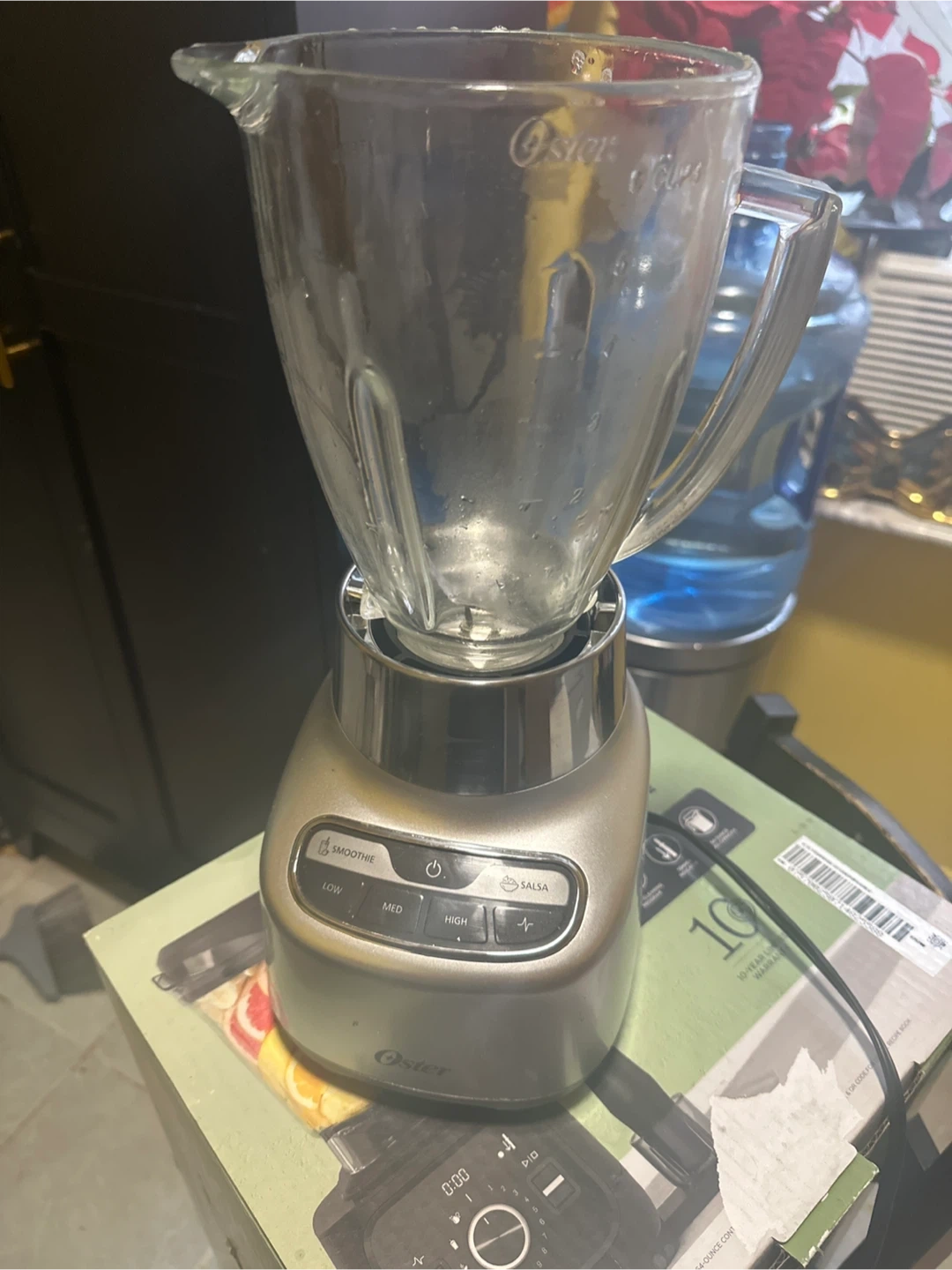 Selling an Oster blender. It features multiple settings including smoothie, low, medium, high, and salsa. The blender comes with a 10-year limited warranty.