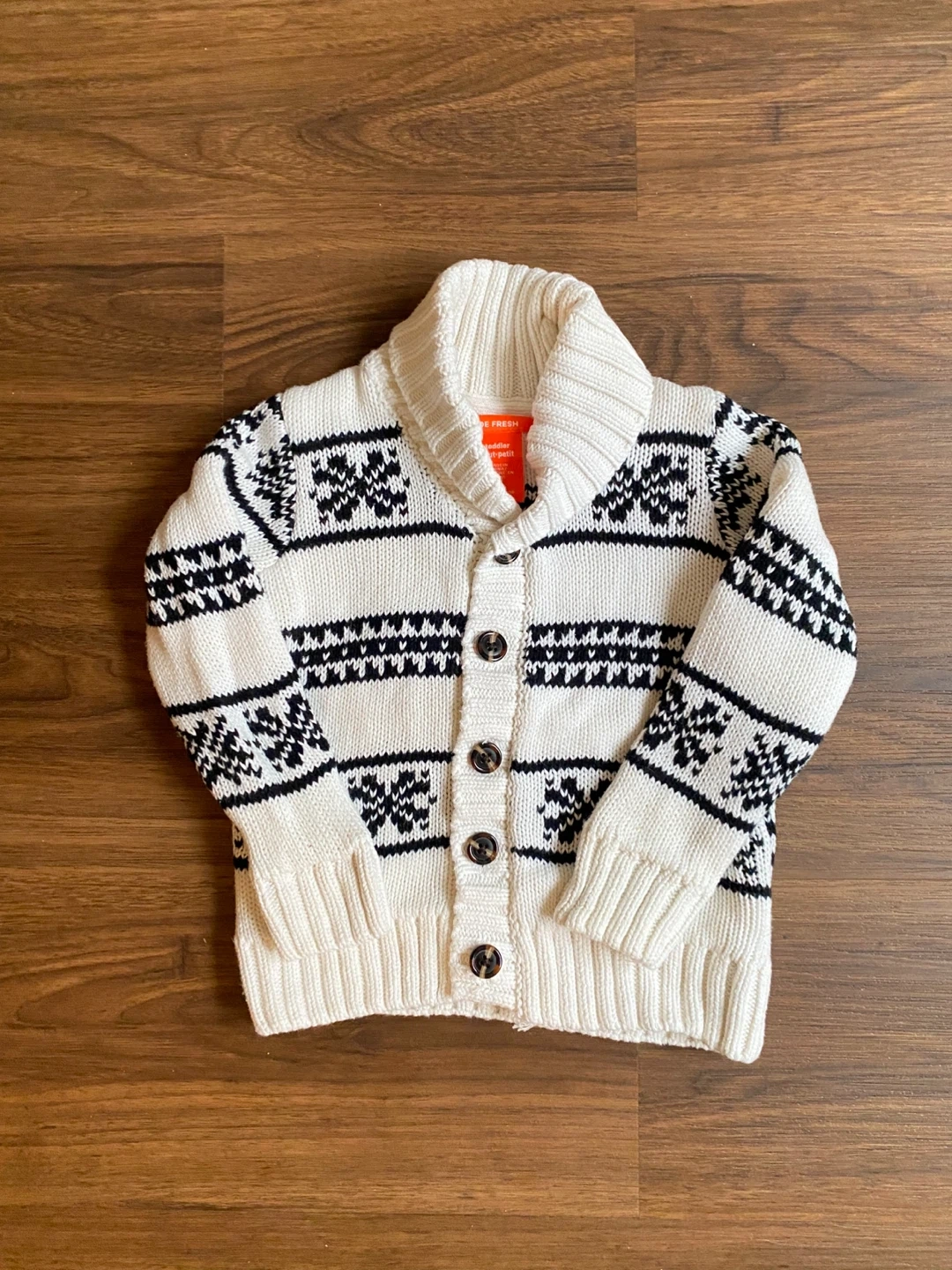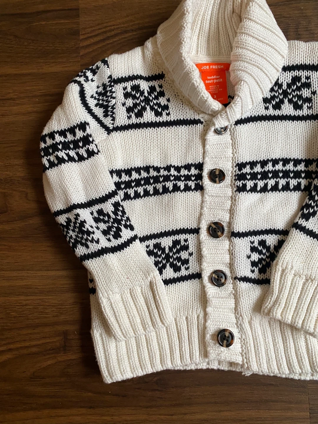 A cozy Joe Fresh knit cardigan for toddlers, perfect for layering! It's a size 3 and features a lovely knit snowflake pattern in cream and black. Great for keeping your little one warm and stylish this winter cold season