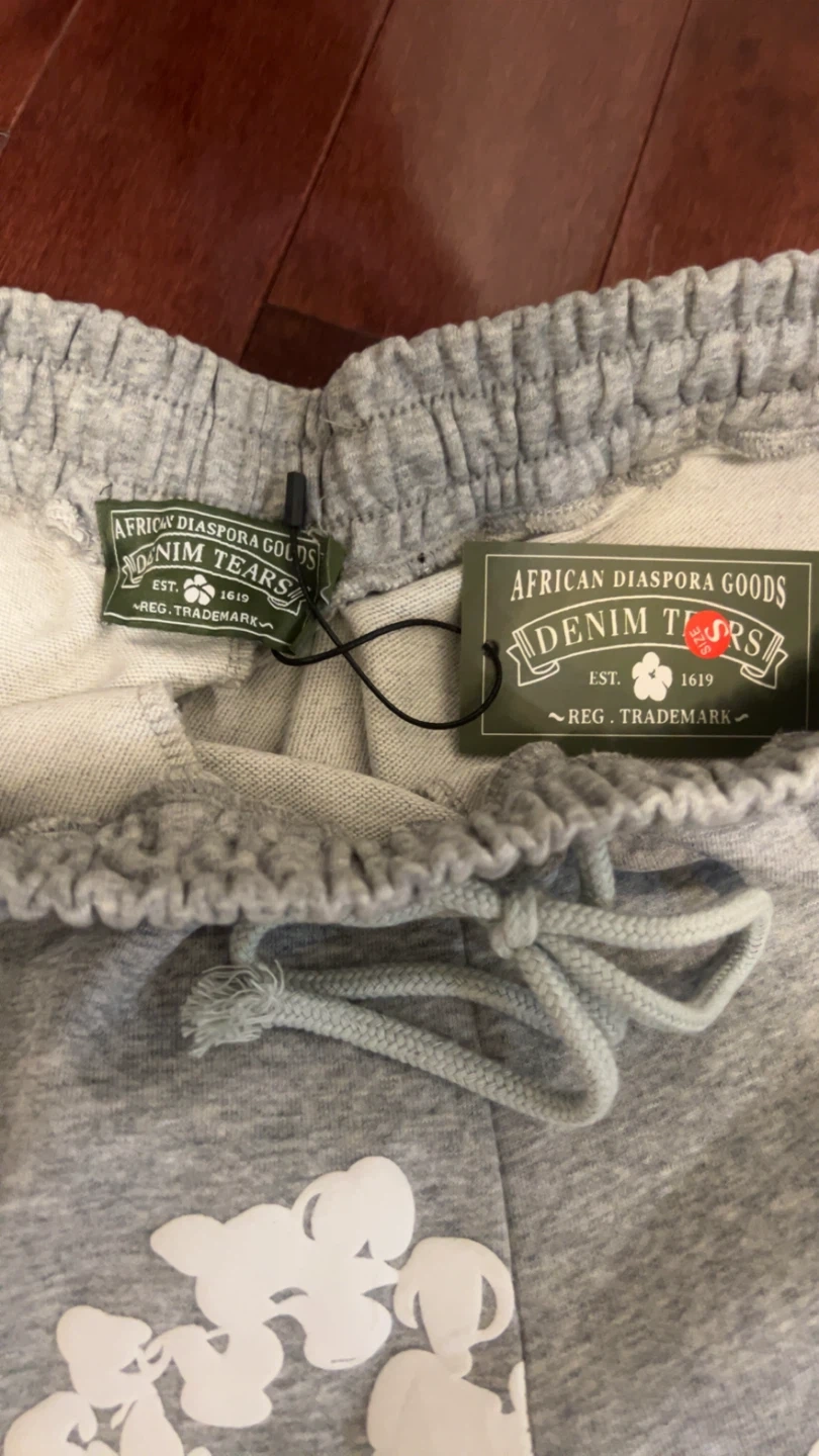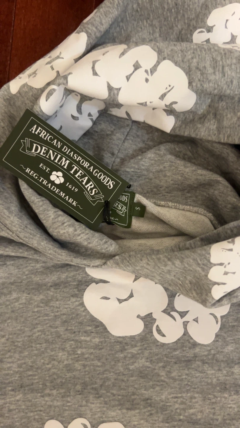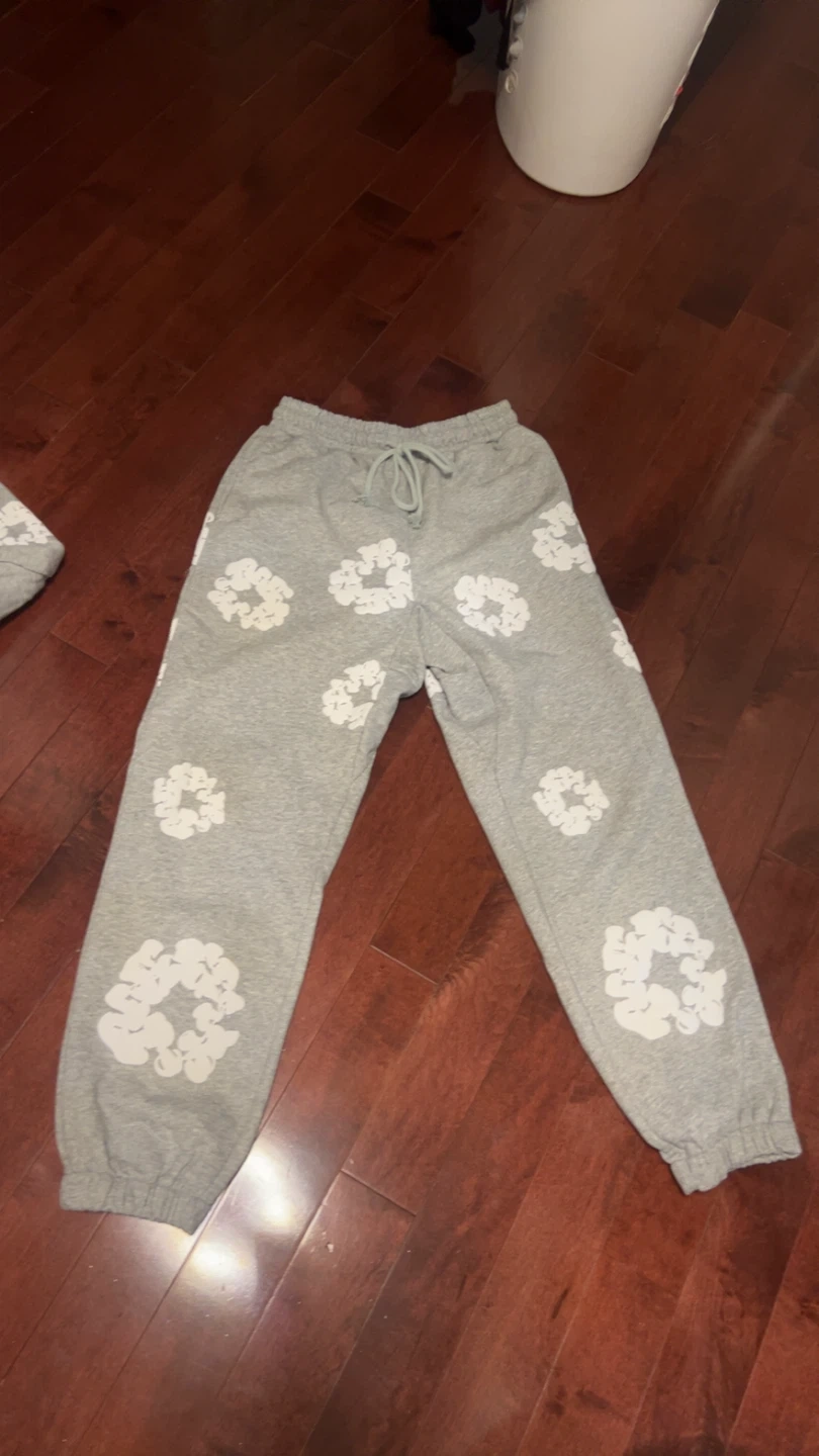Selling a Denim Tears hoodie and sweatpants set in size small. The set is grey with white floral designs. Both pieces are in great condition and ready for a new owner!