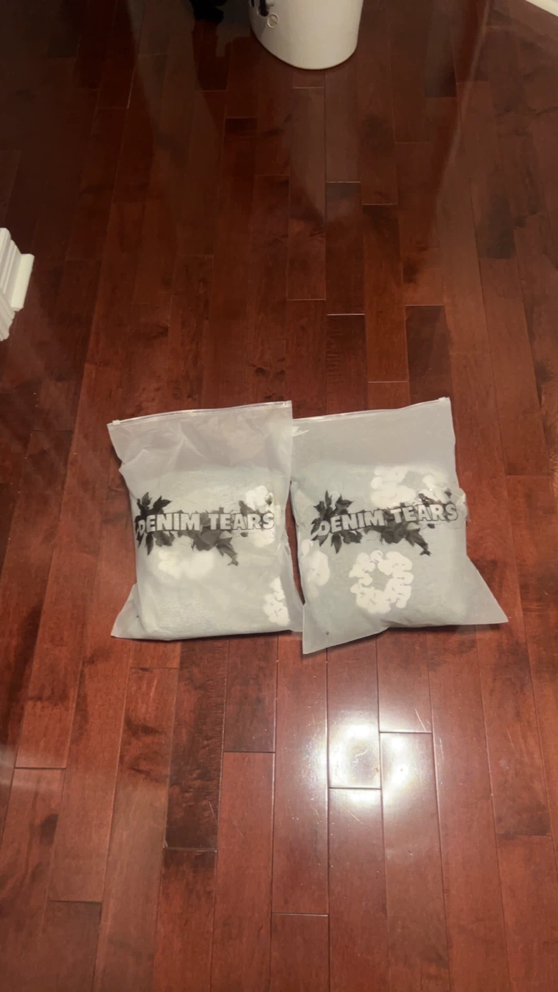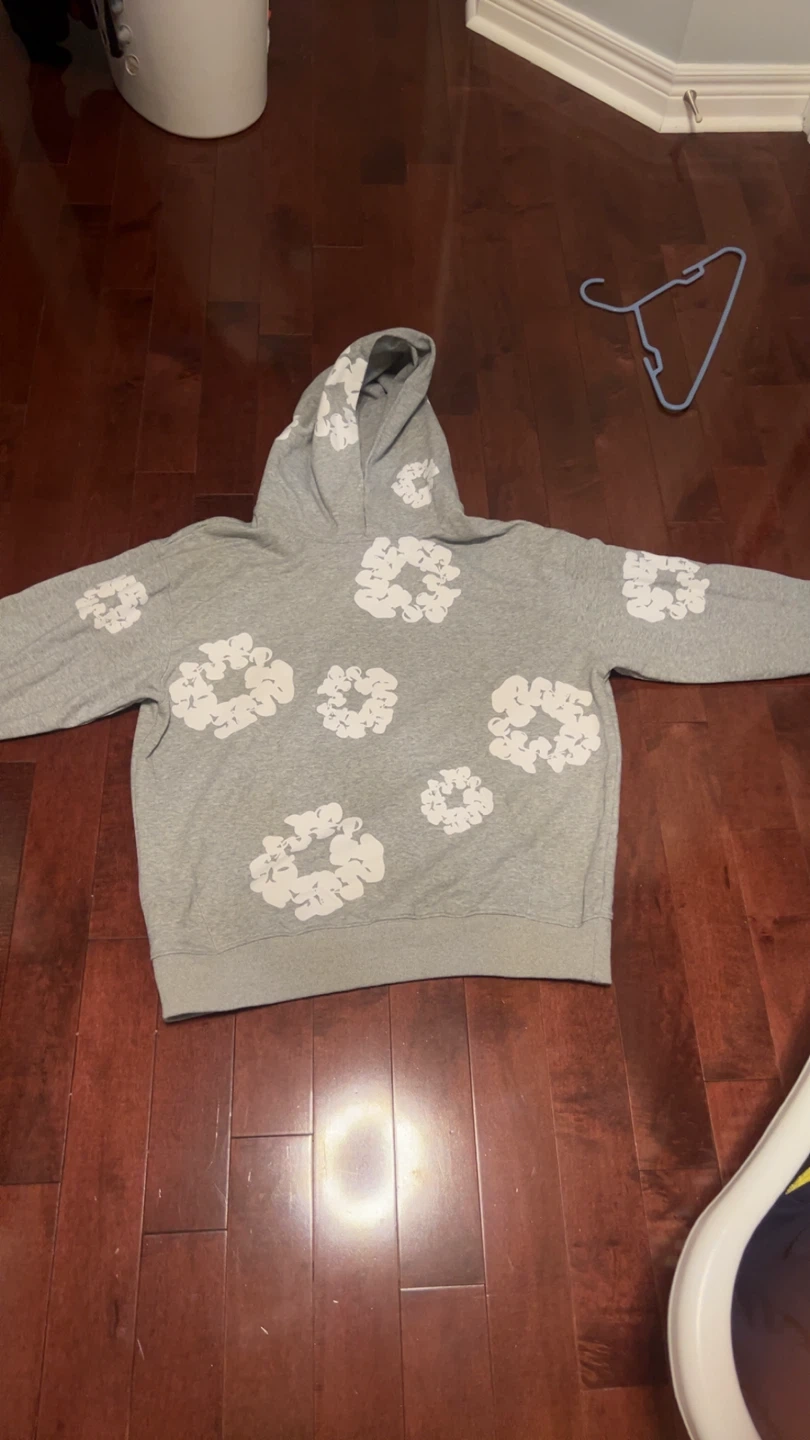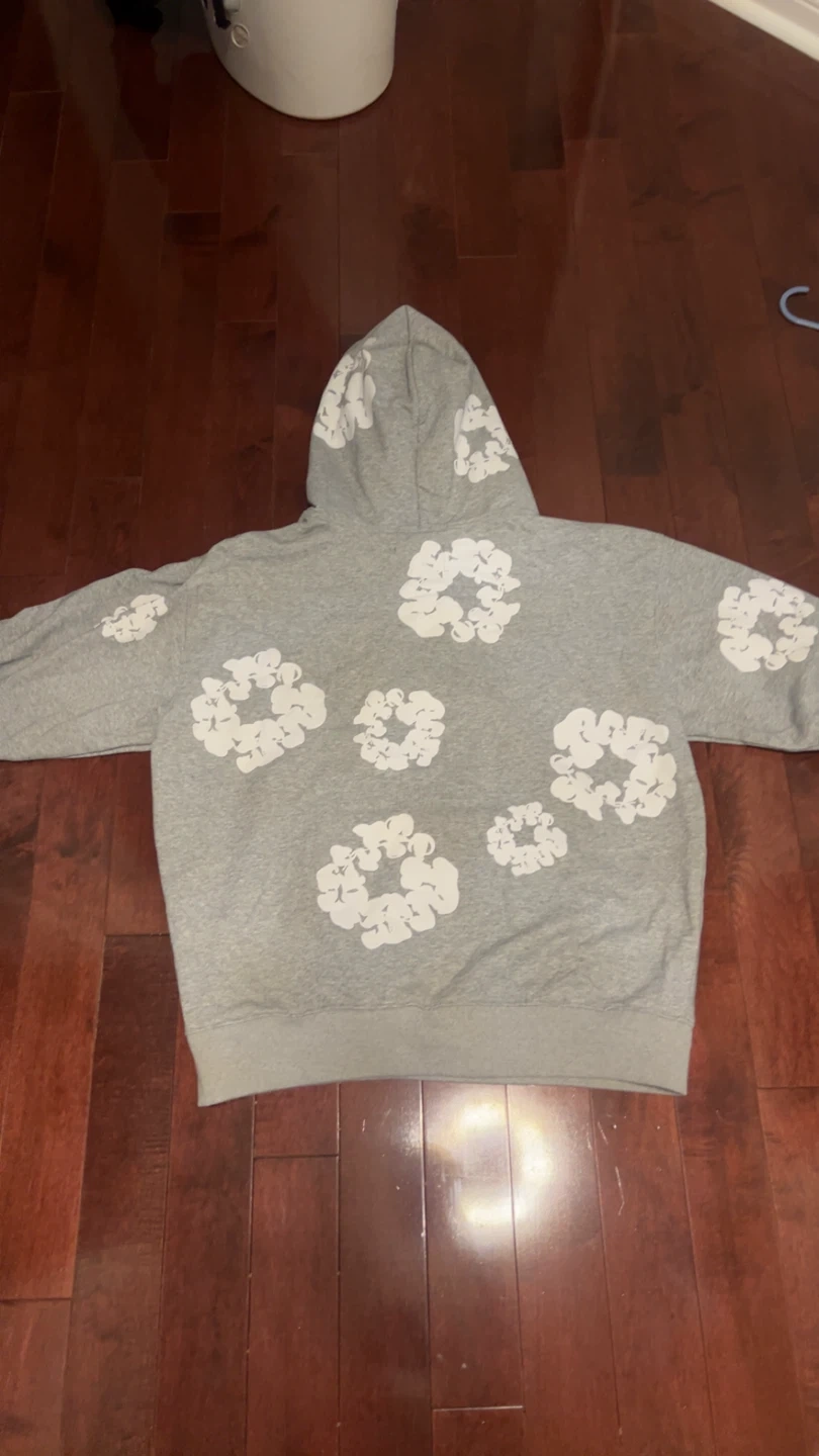 Selling a Denim Tears hoodie and sweatpants set in size small. The set is grey with white floral designs. Both pieces are in great condition and ready for a new owner!